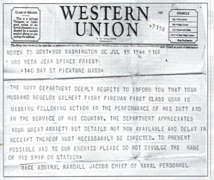 Before enlisting, Frisby worked as a turpentine still operator for Crosby Naval Stores, a division of the Goodyear Yellow Pine Company. In 1940, he married Veda Jean Spikes of Poplarville, Mississippi, with whom he would have one daughter, Barbara. On April 28, 1943, Bigelow Frisby joined the Navy and enlisted in Jackson, Mississippi.