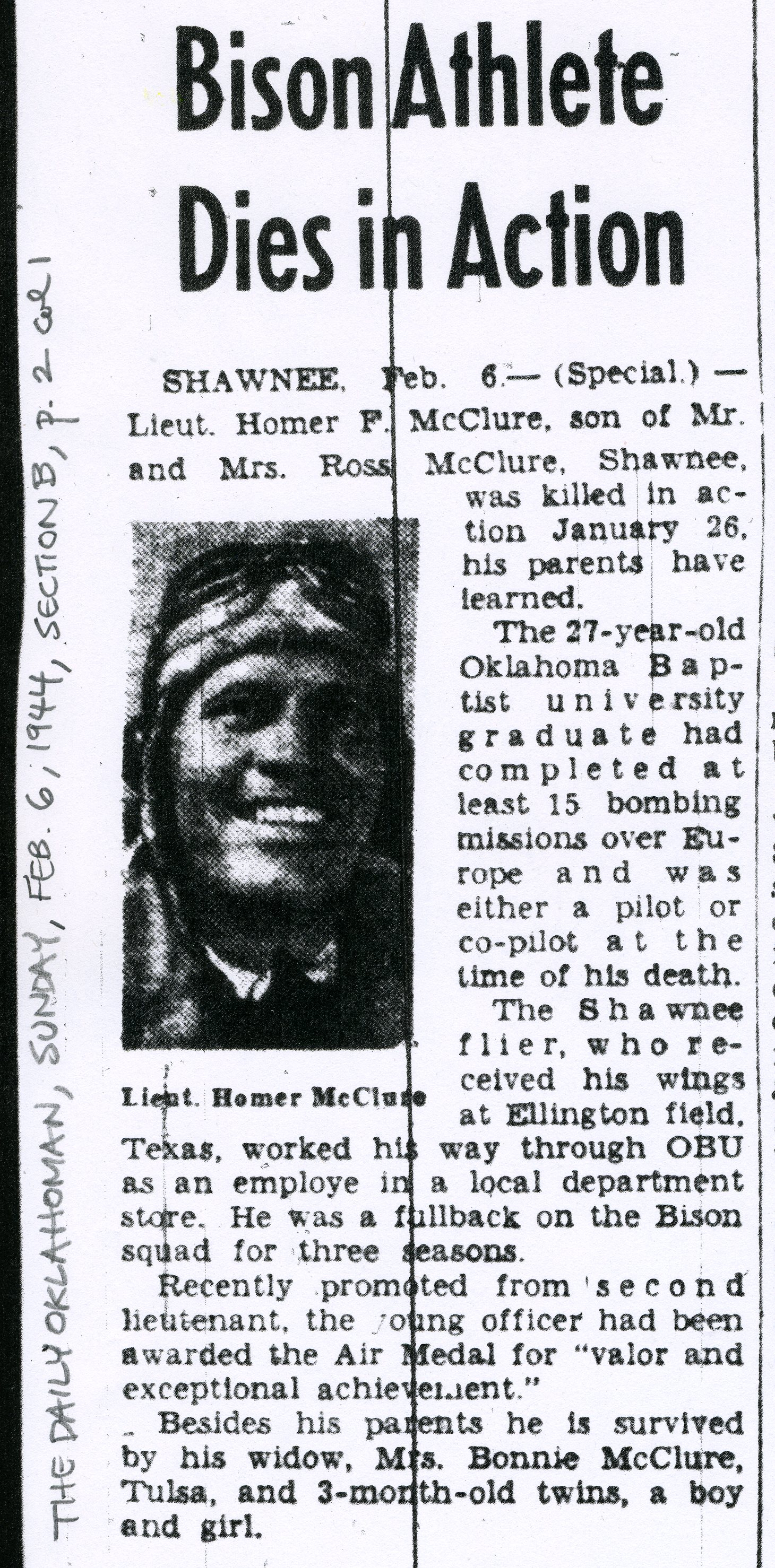 “Lieut. Homer R. McClure Reported Killed In Action.” The Carnegie Herald, February 2, 1944. Oklahoma History Center Archives.