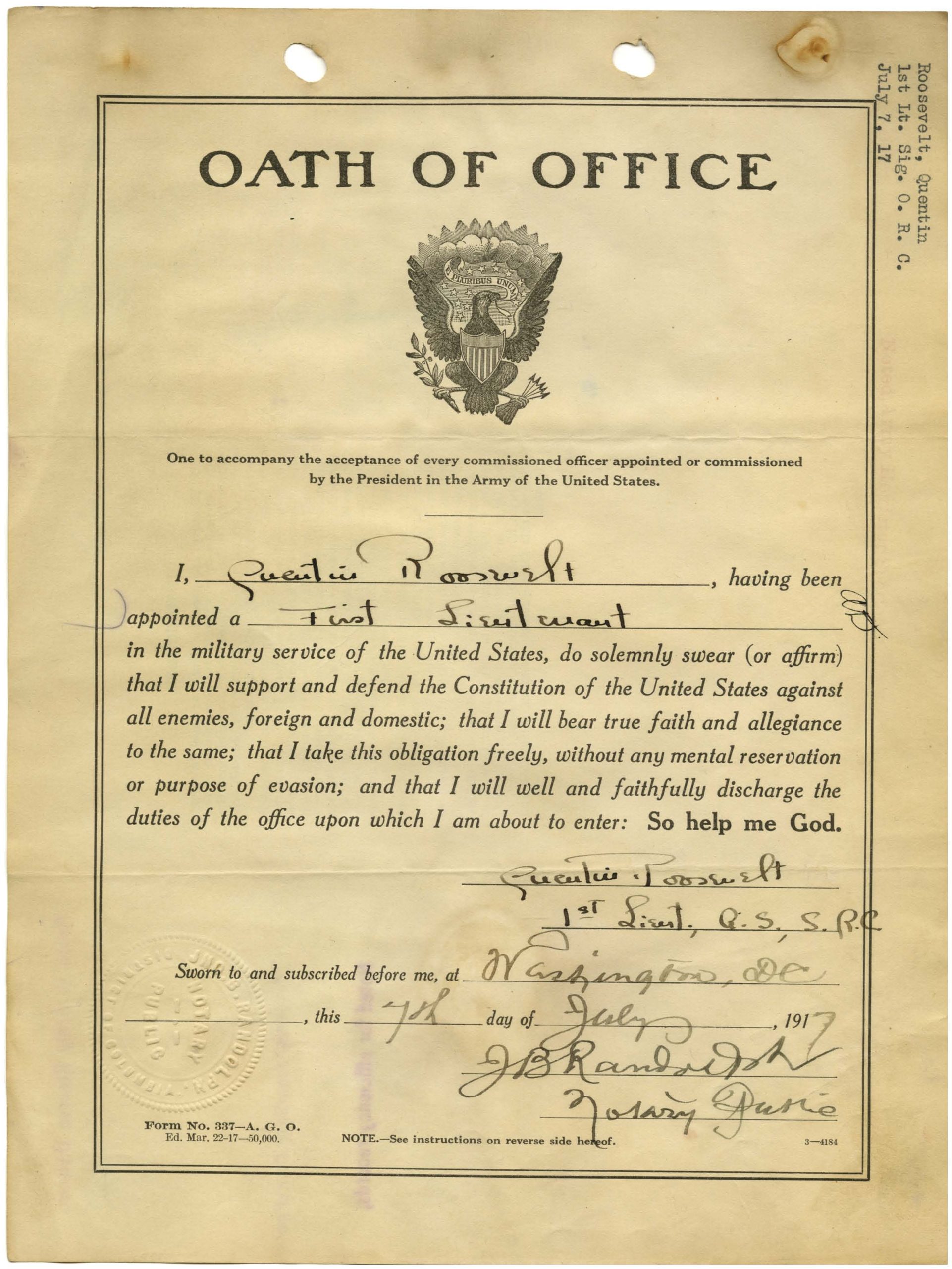 On April 23, 1917, Roosevelt enlisted at Aviation Station, Mineola, Long Island, and reported for duty on April 25, 1917. After several months serving as a sergeant and receiving additional training, he was commissioned as an officer in the Aviation Section of the Signal Officers’ Reserve Corps as a first lieutenant on July 7, 1917. He swore the oath of office in Washington, D.C.