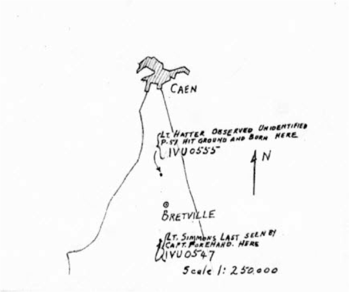 Exceptionally bad weather prevented flights on June 9, but otherwise, Simmons flew a mission every day from June 6, 1944, until his last on June 11, 1944. On the morning of June 11, pilots of the 368th escorted B-26 Martin Marauder medium bombers to the Paris area. In the afternoon, they took off with 250 pound bombs and as bad weather began to roll in, they released their payloads near Falaise, France. On the return, the pilots of the 368th attacked truck convoys. Railroad tracks and boxcars southeast of Vire, France were also targeted. The pilots came home to Wretham Hall in pairs. All pilots returned that day, except Simmons. Anti-aircraft flak south of Caen, France broke his plane in two and he crashed. He was not even 24 years old.