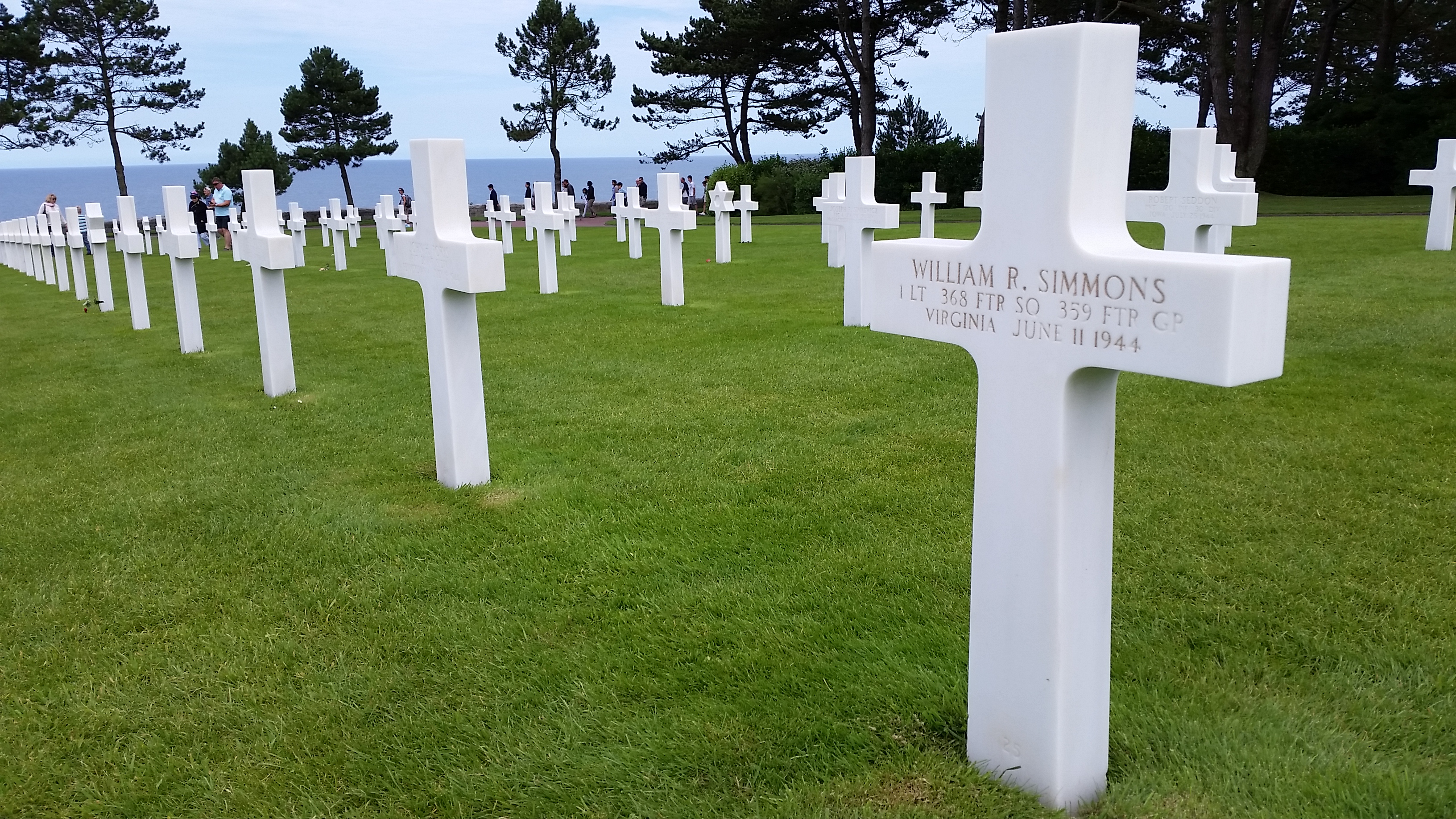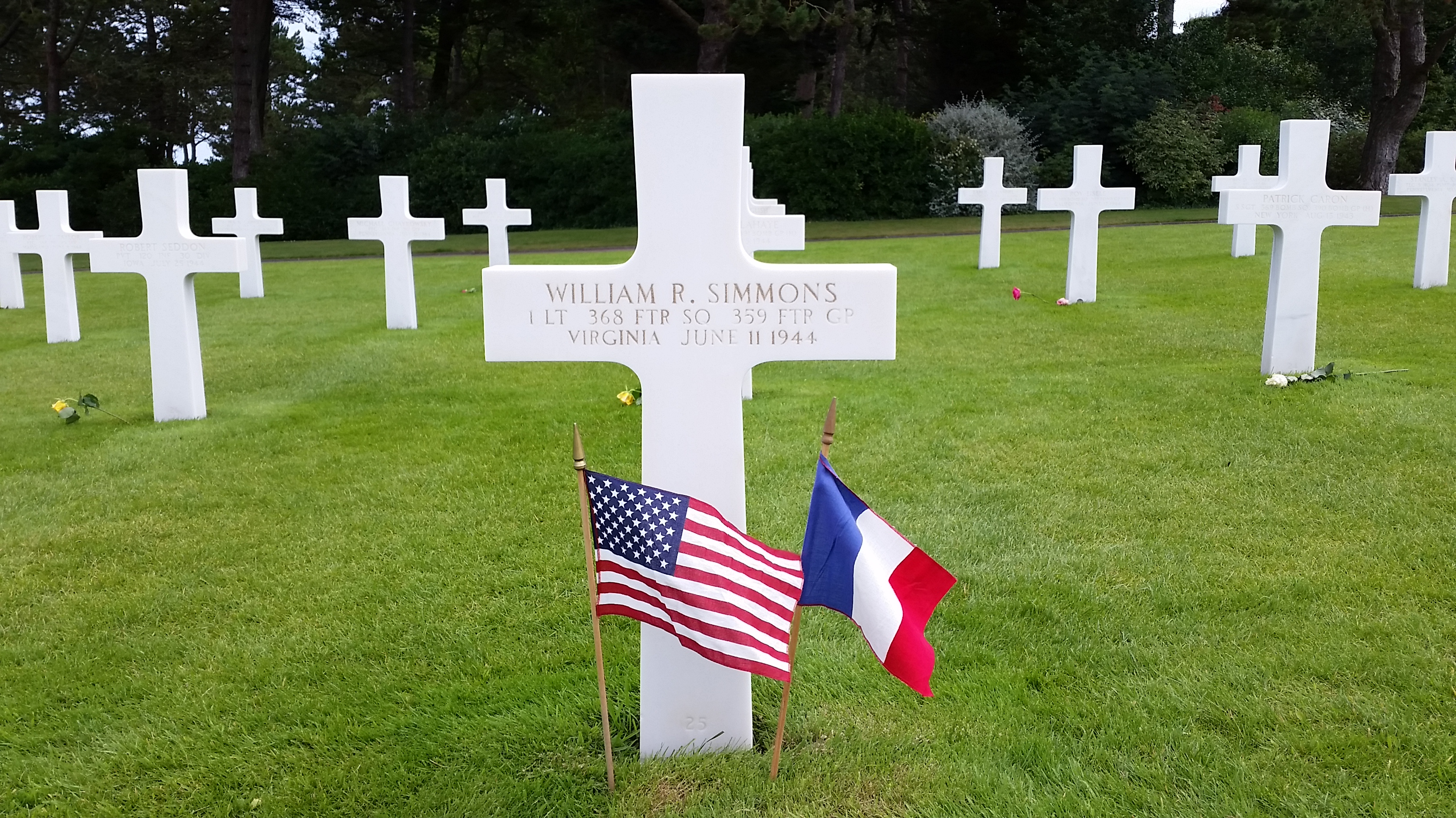 Simmons was buried in a temporary grave, on site, the day his plane crashed in a small town south of Caen, France (See Figure 5). A French family witnessed the crash and helped to identify him by the wedding ring he wore which was engraved, “Forever, June 3, 1943.” Simmons’ father made the decision to allow his son to rest in France. Simmons’s body remained in a temporary grave until April 29, 1949, when his remains were transferred to the Normandy American Cemetery overlooking Omaha Beach.