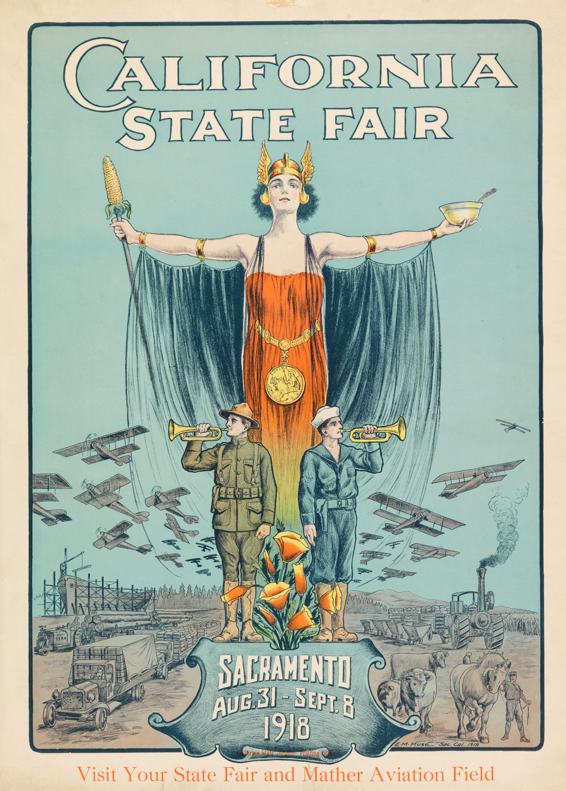 California State Fair, Sacramento, Aug. 31-Sept. 8, 1918. Visit Your State Fair and Mather Aviation Field. Poster. 1918. Sacramento Public Library. https://delivery.library.ca.gov:8443/delivery/DeliveryManagerServlet?dps_pid=IE227365.