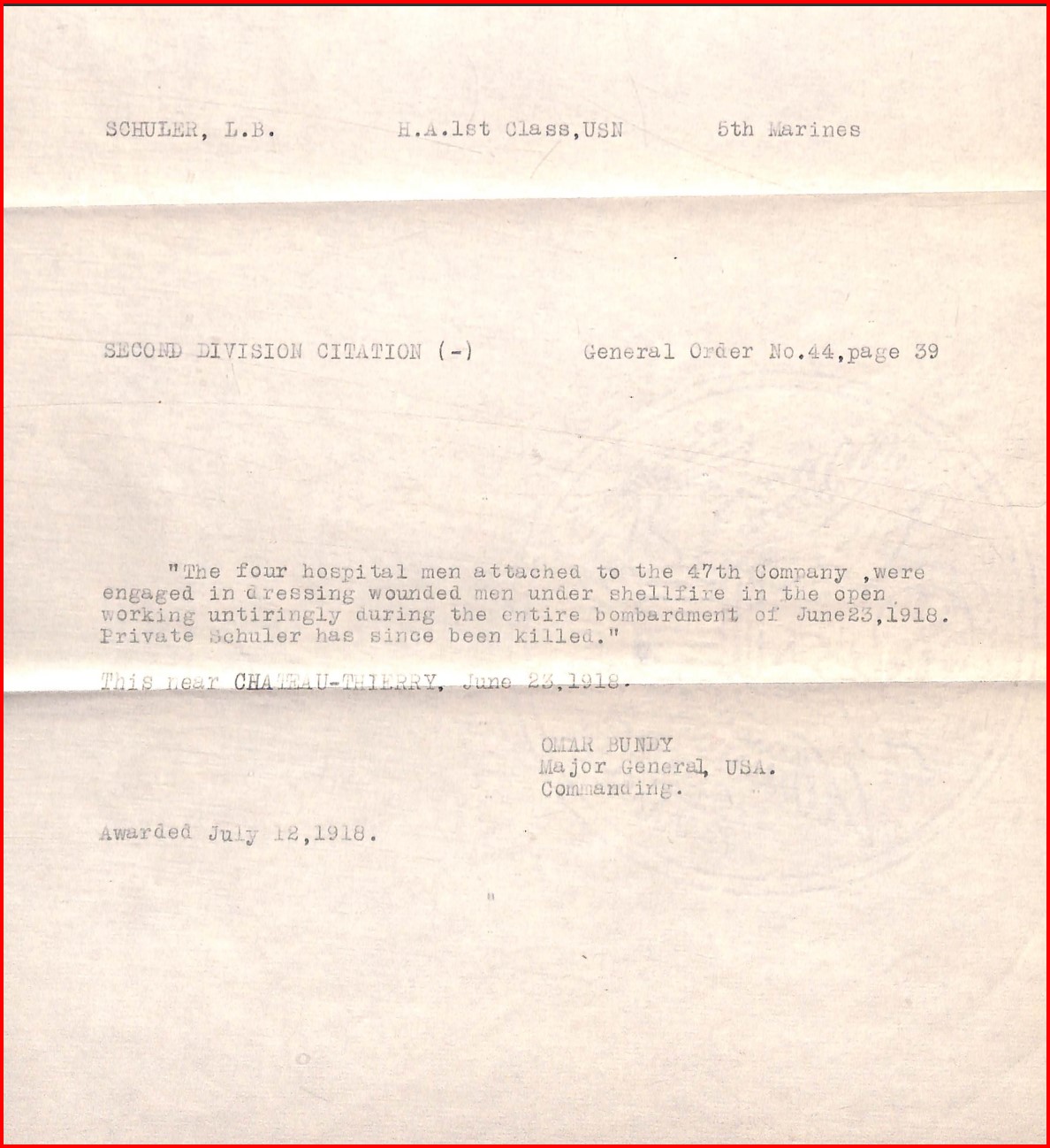 Schuler and every other hospital corpsman on the battlefield that day faced a formidable challenge. While under assault by bullets and shrapnel and surrounded by clouds of toxic gas, they valiantly attended to the thousands of wounded Marines. Schuler and three other hospital men working with him that day were “engaged in dressing [bandaging] wounded men under shell fire in the open working untiringly during the entire bombardment of June 23, 1918.” Schuler was shot during this action.