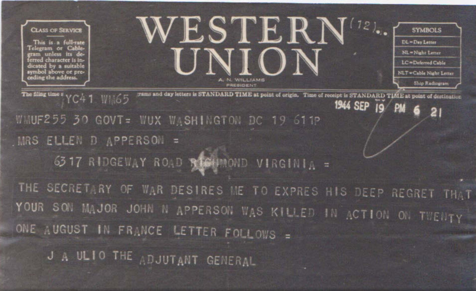 On September 19, 1944, Apperson’s mother and uncle received notification of his death from a Western Union telegram delivered to their home in Richmond. The family spent the next year trying to uncover more details about Apperson’s death.