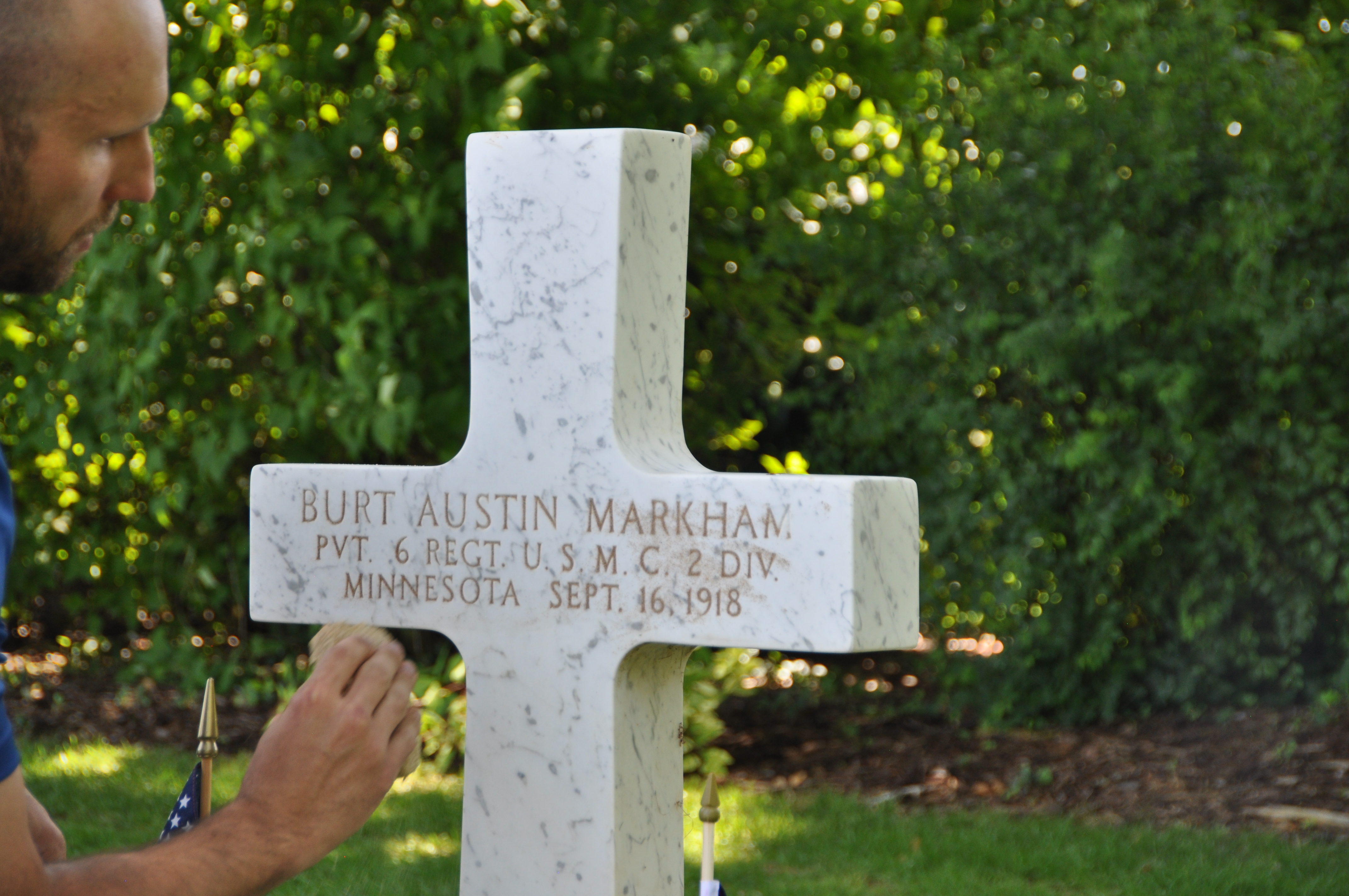 John and Nellie Markham were informed of their son’s death on December 14, 1918. They decided to leave him buried in France because, as Nellie wrote, that is where he “fought and died.” In 1929, Nellie Markham was invited to join the Gold Star Mother Pilgrimage to visit her son’s grave. She accepted the invitation and began the journey from Minnesota to France on July 19, 1930. After ten days of travel Mrs. Markham arrived in Cherbourg, France and on August 4, Nellie Markham stood at her son’s final resting place.