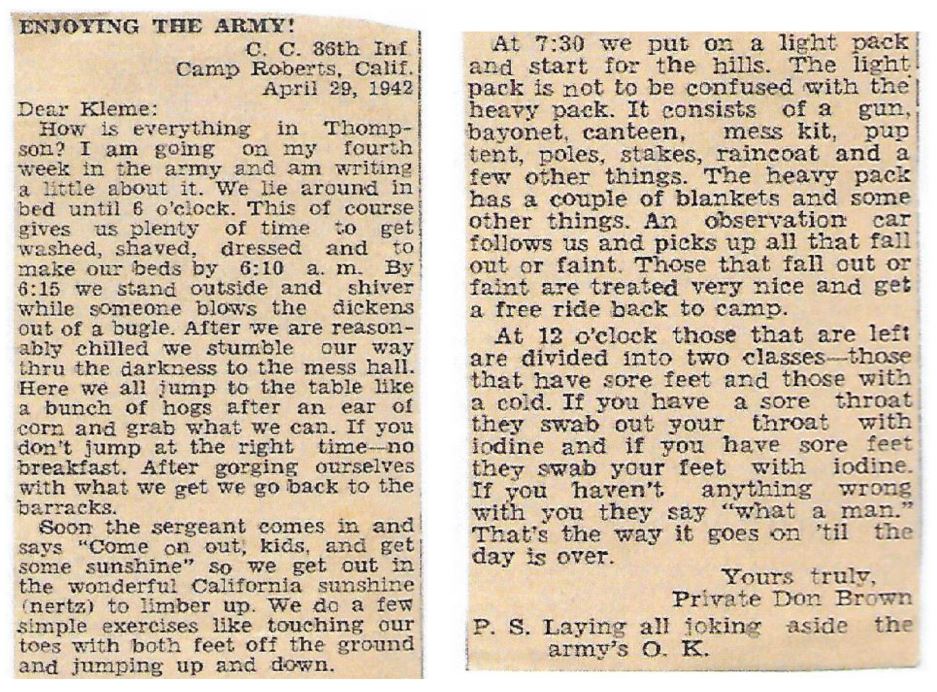 While in California, Brown frequently sent letters home. His mother kept him updated on life in Thompson and family happenings. He wrote to them about training and how he looked forward to being back on Iowa soil soon.
