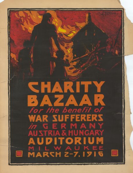 Called the “German Athens” and “The Munich of the Midwest,” Milwaukee had a strong German-American presence. Around the time of World War I, there were more German-born Milwaukeeans than native born. Prior to the American entrance into the conflict, the city supported the German people in Europe. The charity War Bazaar held in 1916 became one of the biggest events of the decade in Milwaukee. Organized to benefit German and Austrian war sufferers, including the widows and orphans of fallen soldiers, the event was attended by 175,000 people and raised more than $150,000.