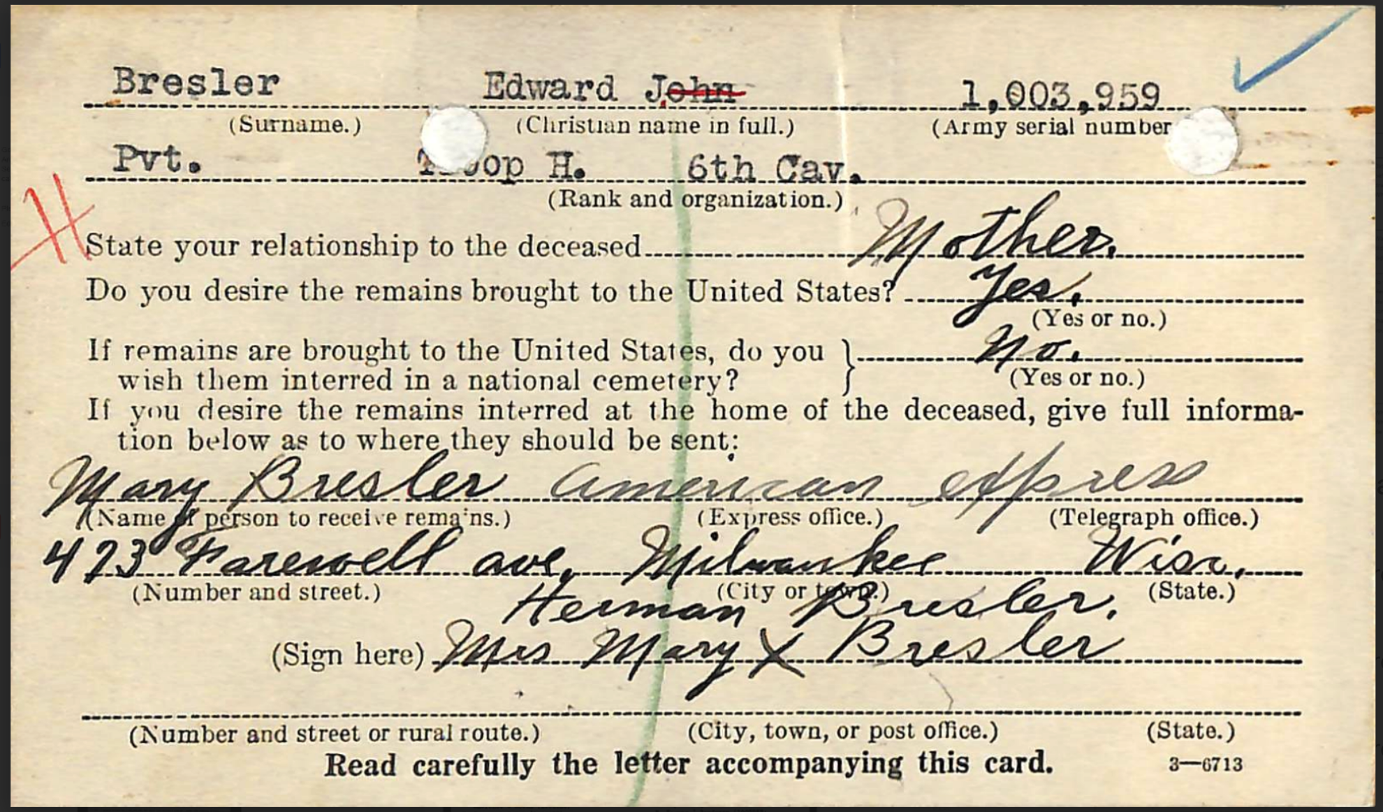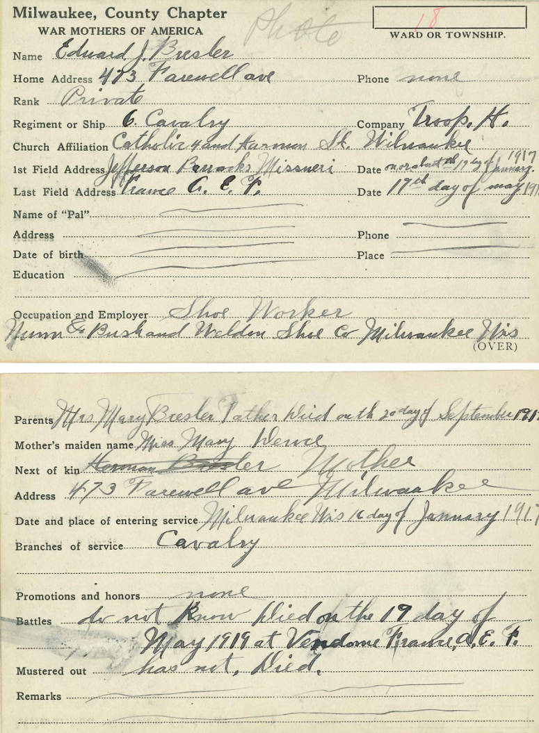 Edward J. Bresler. American War Mothers WWI Servicemen, Milwaukee Public Library. https://content.mpl.org/digital/collection/WWI/id/24931/.