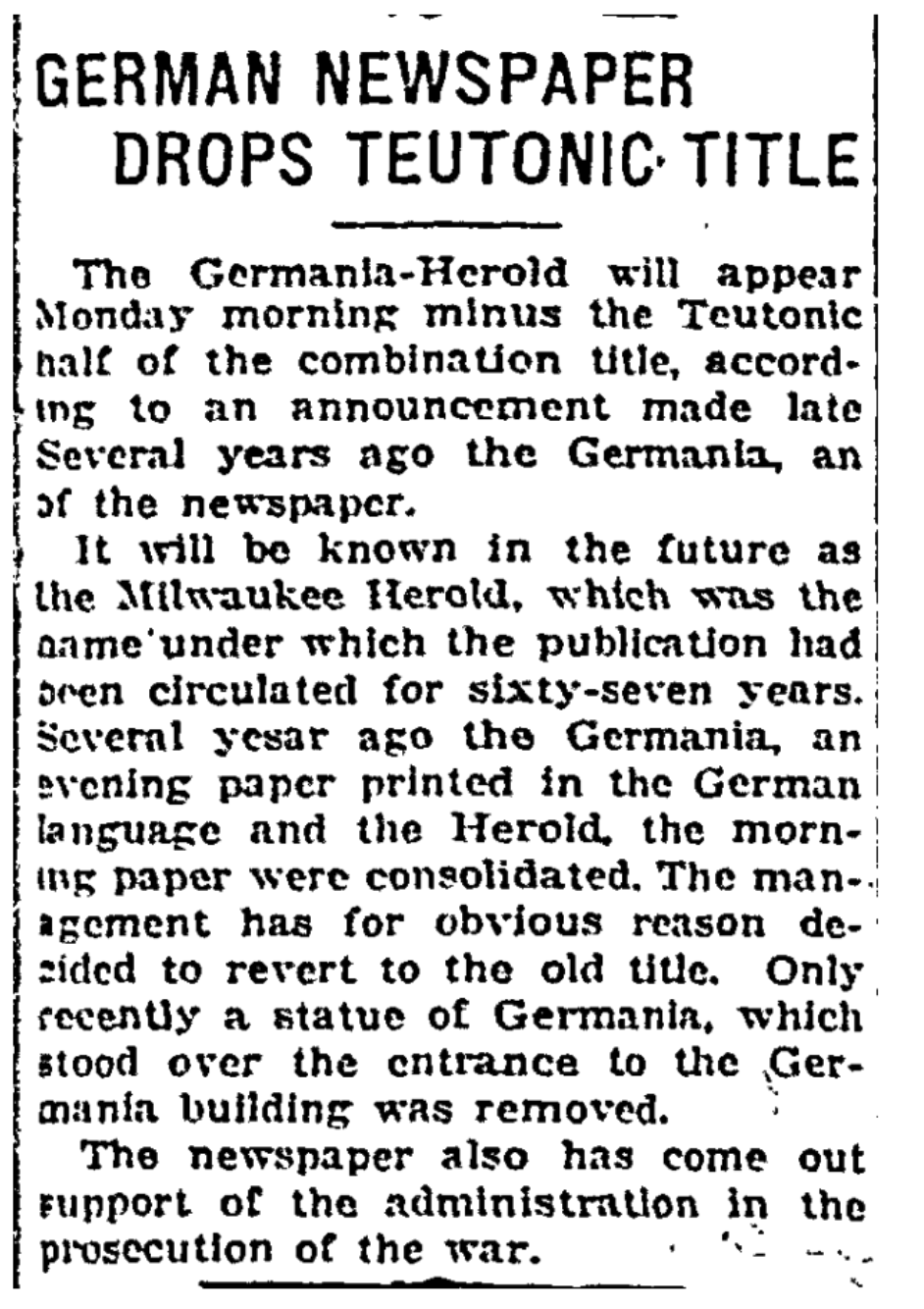“German Newspaper Drops Teutonic Title.” Milwaukee Sentinel [Milwaukee, WI], May 27, 1918. https://infoweb.newsbank.com/.
