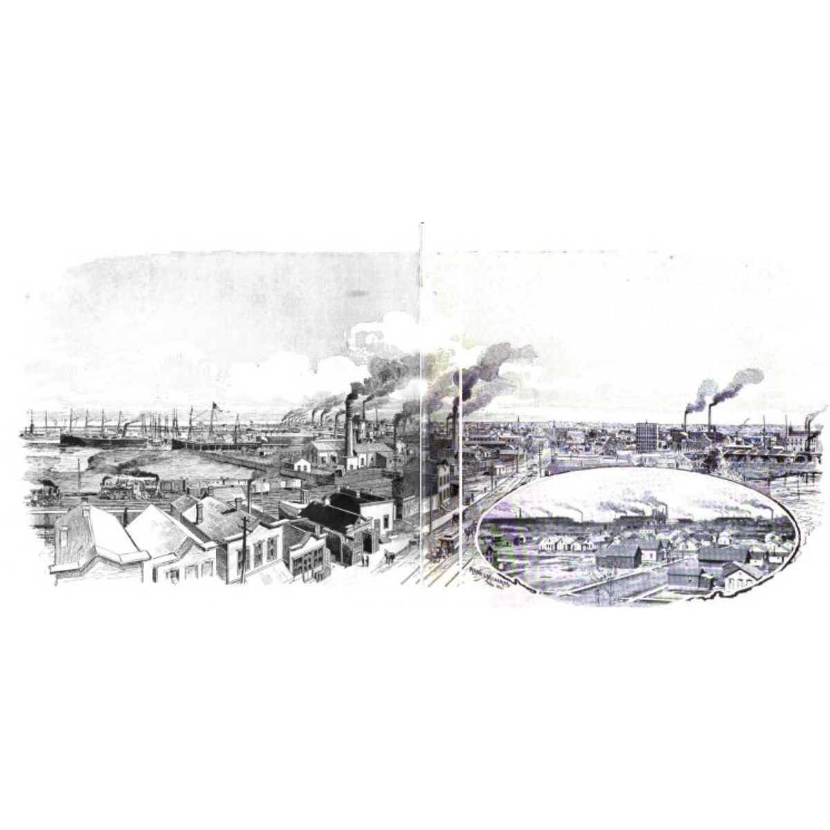 South Side Manufacturing District. Panoramic Sketch. In Anderson, W.J. and Julius Bleyer, Eds. Milwaukee’s great industries: a compilation of facts concerning Milwaukee’s commercial and manufacturing enterprises, its trade and commerce, and the advantages it offers to manufacturers seeking desirable locations for new or established industries. Association for the Advancement of Milwaukee, 1892. https://catalog.hathitrust.org/Record/008597843.
