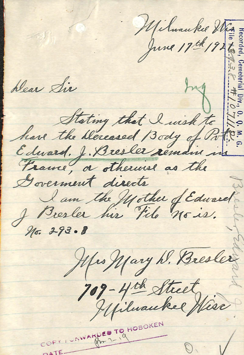 Seven months after the armistice, Edward Bresler died in Vendome, France, on May 19, 1919. The cause of his death was complications related to periodontitis and a ruptured appendix. He was initially prepared to be sent home to Milwaukee in 1920 at the request of his mother. However, his mother made the difficult decision to leave his remains in France.