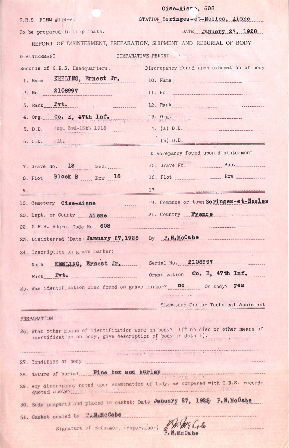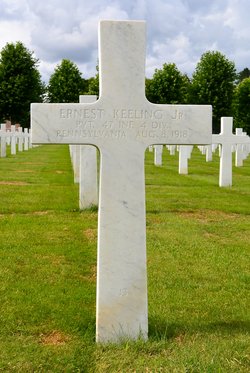 In the uncertainty of the offensives and counteroffensives of the Aisne-Marne operations, Keeling was initially reported as Missing in Action between August 3 and 13, 1918. The family received a letter from the U.S. War Department in April 1920, which changed his status to Killed in Action. His death was listed as occurring on August 8, 1918, near the Vesle River in St. Thibaut, France. He was initially buried near the site but was later moved to the Oise-Aisne American Cemetery in Seringes-et-Nesles, Aisne, France, in April 1921.