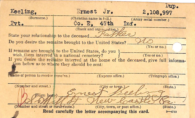Private Ernest Keeling, Jr., was born in Niles, Ohio. He was the third of eight children born to Ernest and Agnes Brooks Keeling. Between 1900 and 1910, the family relocated across the state line to New Castle, Pennsylvania. New Castle was known as a manufacturing town, and his father worked in the tin mill industry throughout his life. Ernest was raised on the south side with the other mill workers’ families. He enjoyed hunting in the local area for small game, and as a young man, the New Castle Herald reported that he killed two rabbits with a single shot!