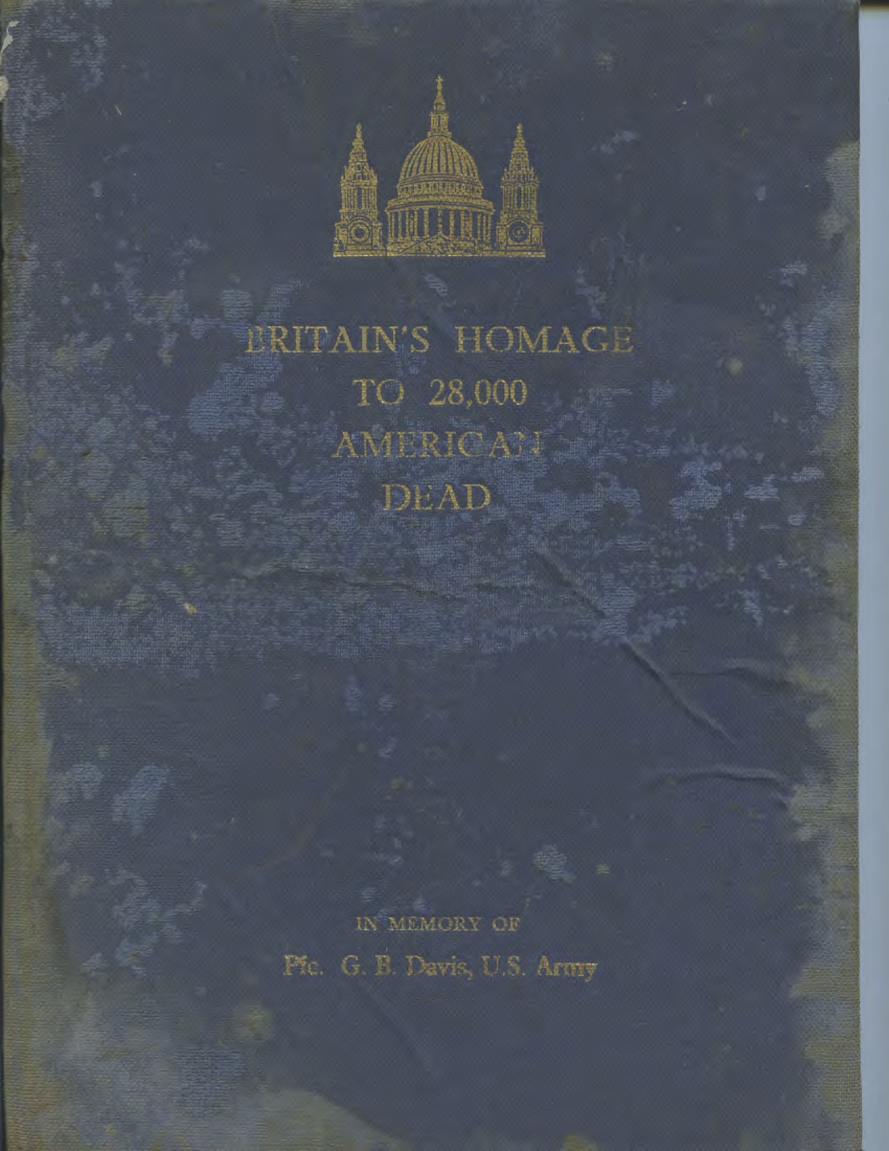In January 1954, Davis’s mother, Loraine, received a package from the London Times in which she found a blue leather bound book titled Britain’s Homage to 28,000 American Dead. At the bottom of the book, the British had embossed, “In Memory of Pfc. G.B. Davis, U.S. Army.” Also enclosed in the package was a letter asking Davis’s mother to confirm that she had received the book. To this day, the Roll of Honour is located in a special alcove in St. Paul’s Cathedral, where each day a page is turned in a special service to honor each soldier for their service during World War II.