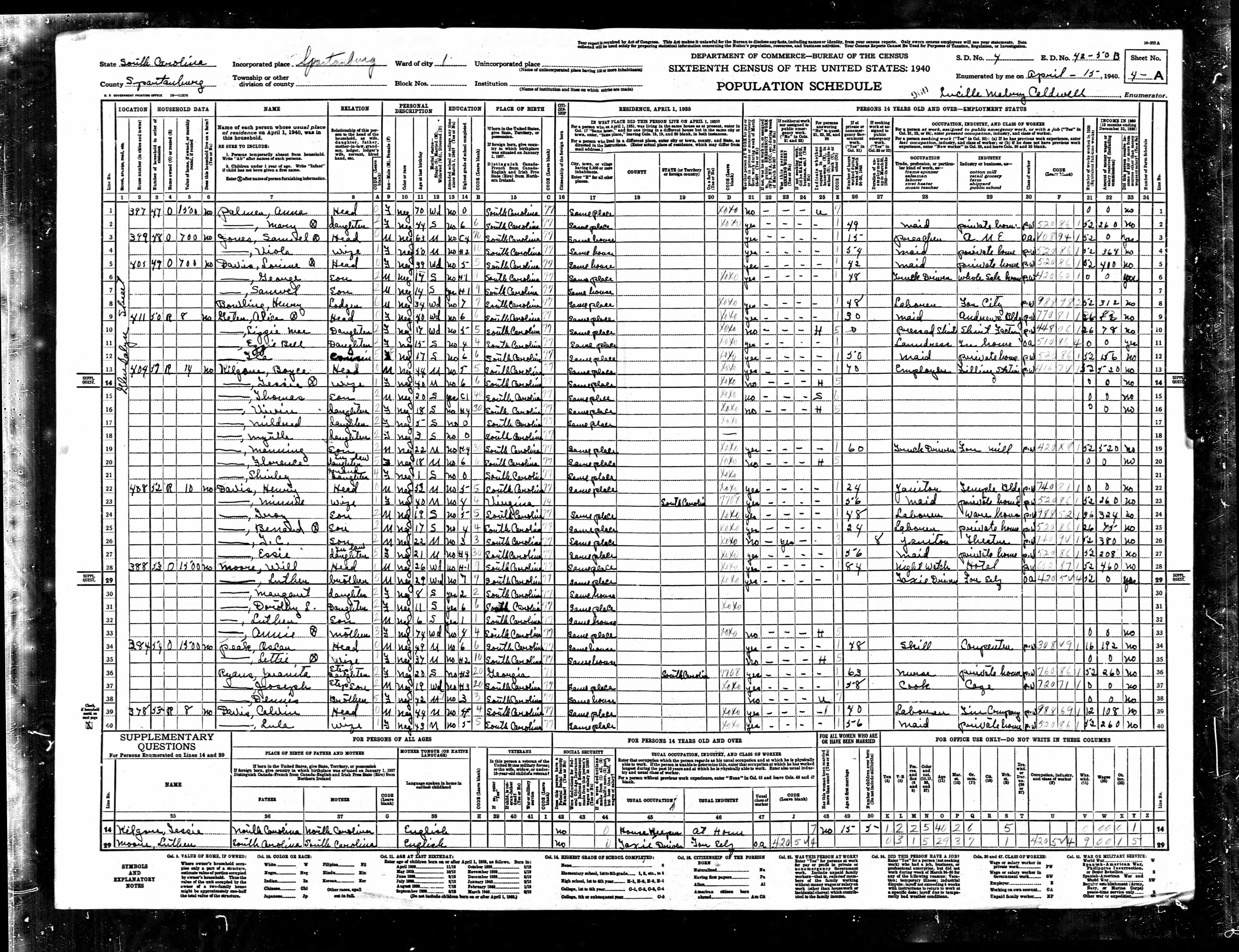 South Carolina. Spartanburg County. 1940 U.S. Census. Digital Images. ancestry.com.