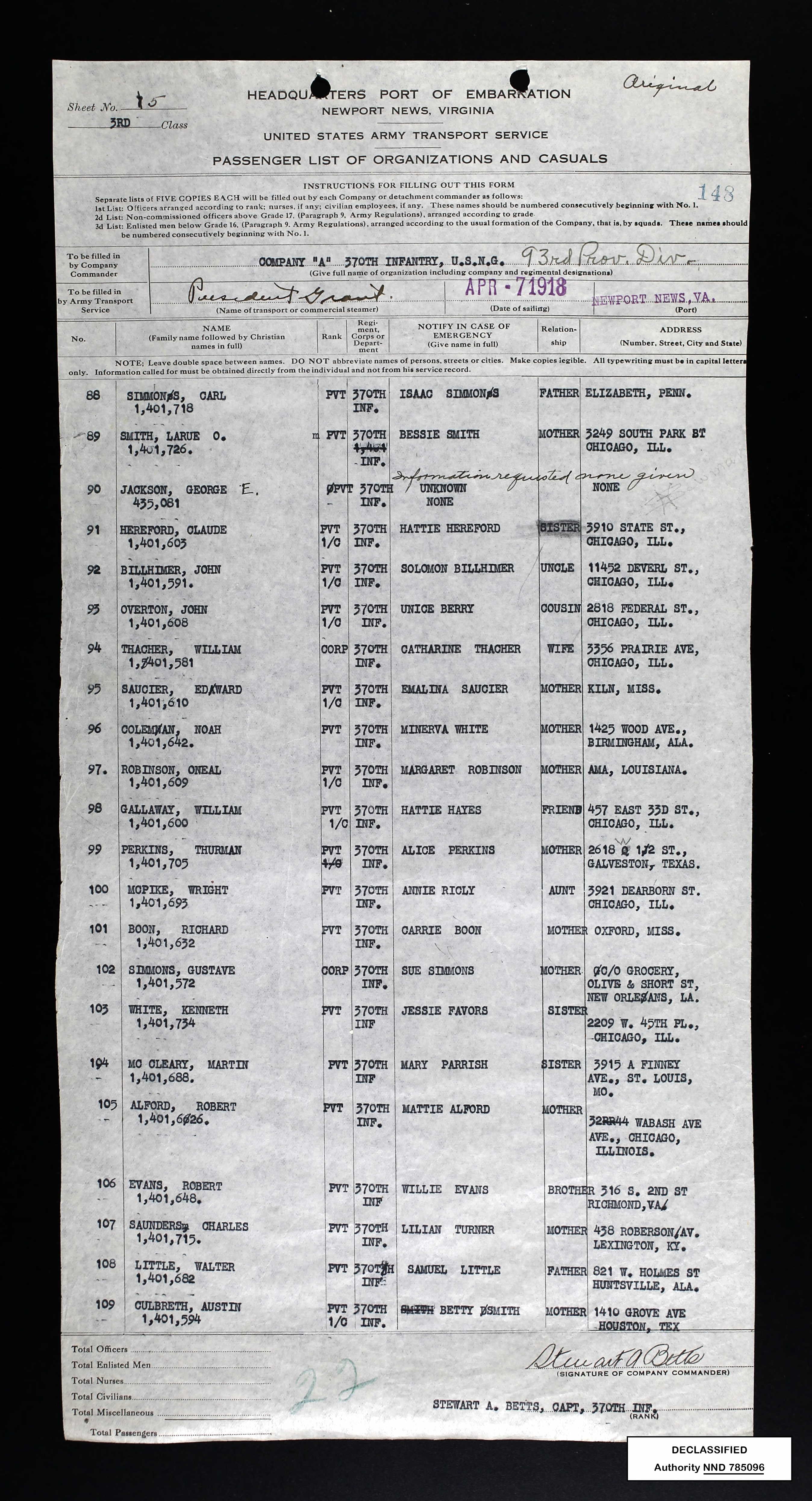 93rd Division, 371st Infantry Regiment; Records of the American Expeditionary Forces (World War I), Records of Combat Divisions, 1918-1919, Record Group 120 (Boxes 2-8); National Archives at College Park, College Park, MD.
