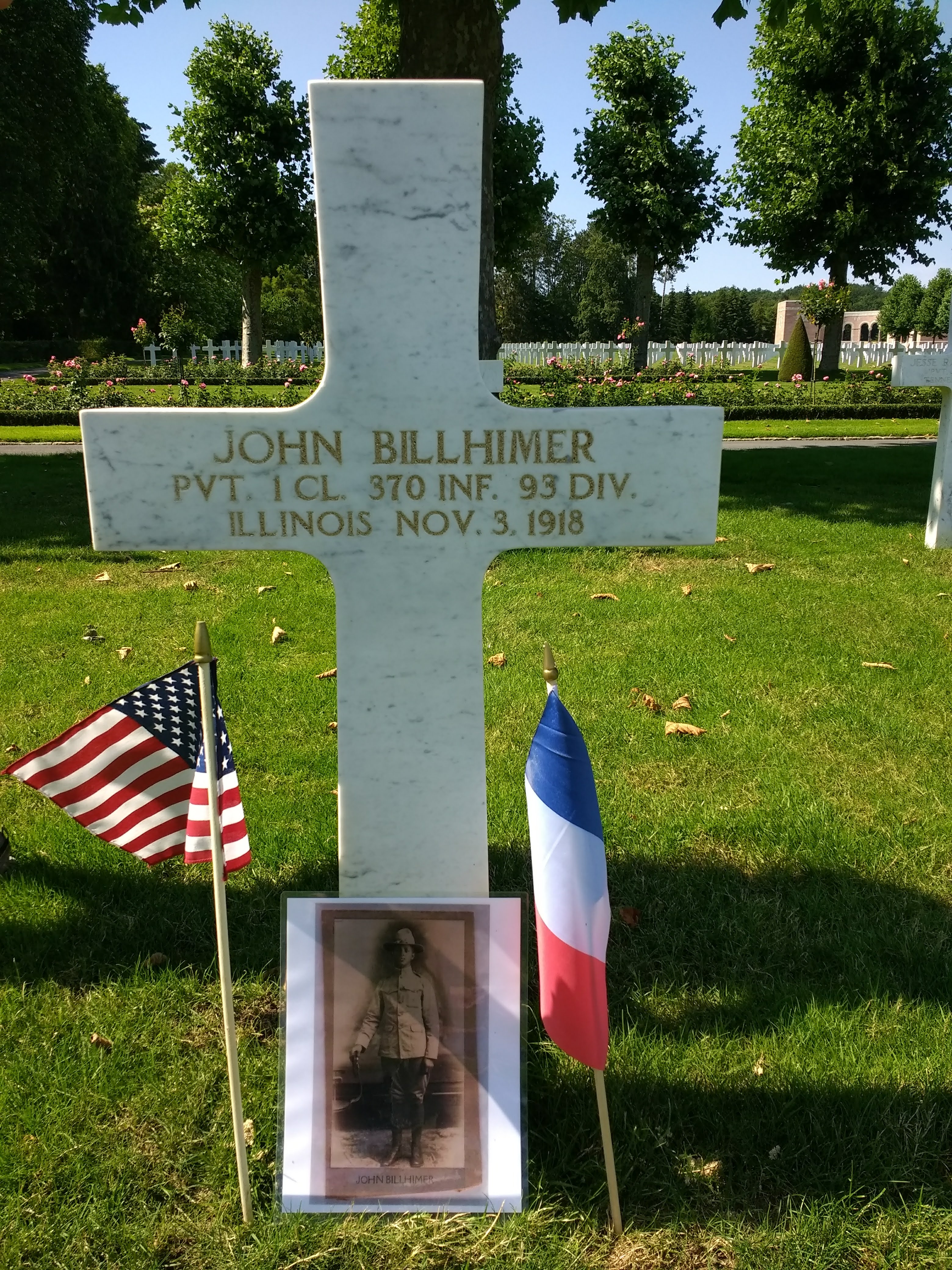 He was a member of the U.S. Army’s 93rd Division which included African American National Guard soldiers from Chicago and New York. The Chicago Division was referred to as the “Fighting Eighth” and was housed in the neighborhood of Bronzeville which had the first armory built exclusively for black soldiers. Private First Class Billhimer and his regiment sailed to France in April 1918 and were trained there between April and August of that year.