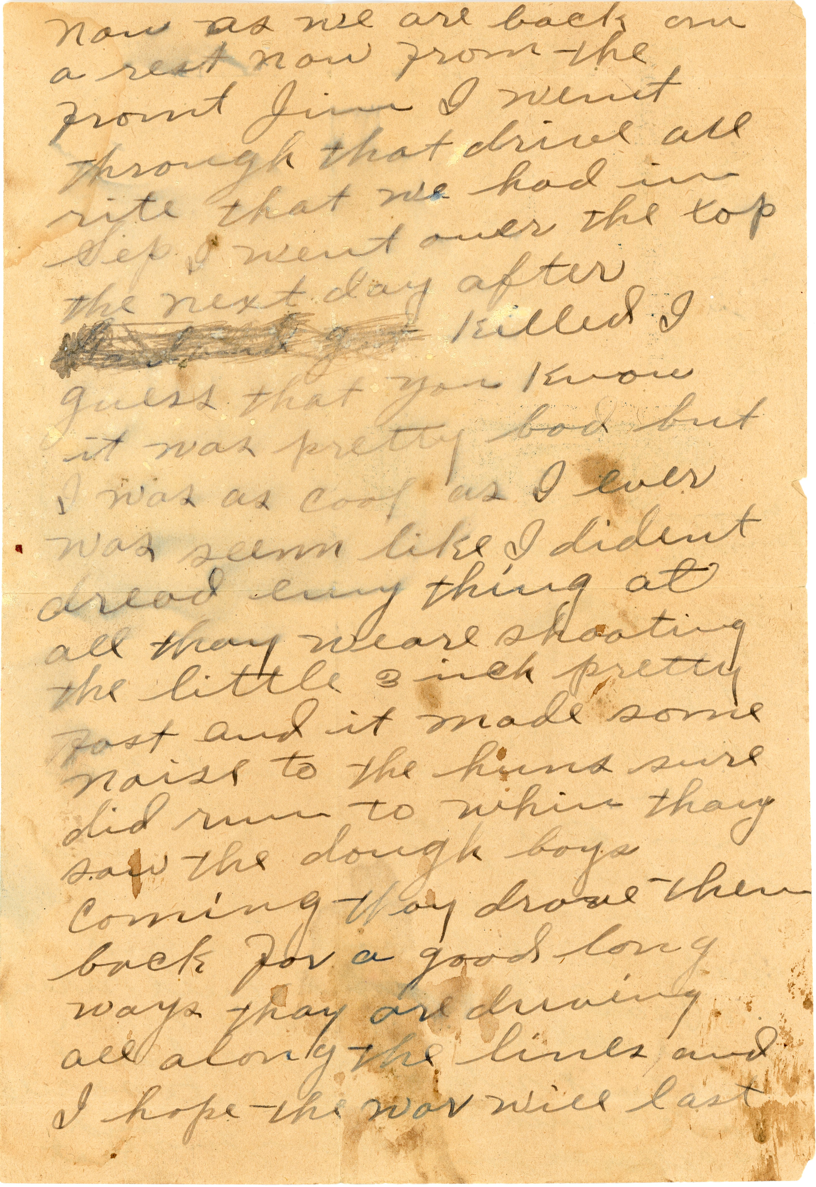 He wrote to his brother Jim, “I weant through that drive all rite that we had in Sep. . . . I guess that you know it was pretty bad but I was as cool as I ever was seem like I dident dread everything at all thay are driving all along the lines and I hope the war will (not) last much longer (sic).”