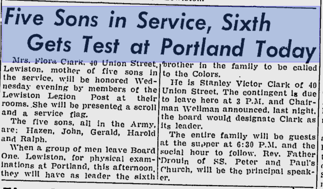 “Five Sons in Service, Sixth Gets Test at Portland Today.” The Lewiston Daily Sun, March 15, 1943.