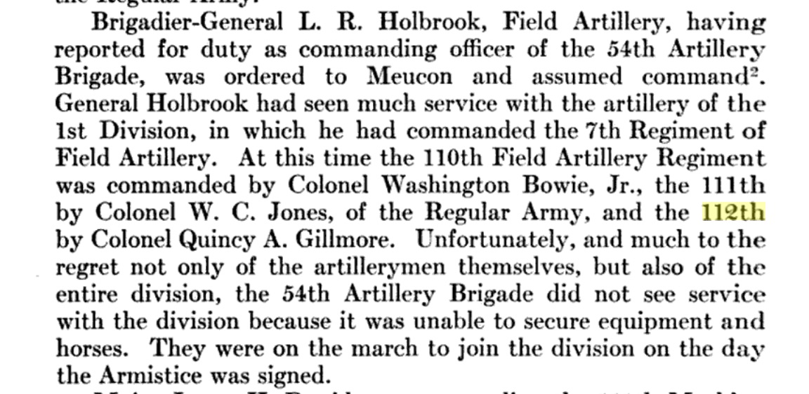 The 112th Heavy Field Artillery Regiment was assigned four cannons, four carriages, 12 caissons to carry ammunition, and 16 limbers to carry an artillery piece. Despite all of these supplies, they were unable to secure enough equipment and horses, and they “did not see service with the division,” but were likely training instead. And “[t]hey were on the march to join the division on the day the Armistice was signed.” Private Collen, however, was not with them.