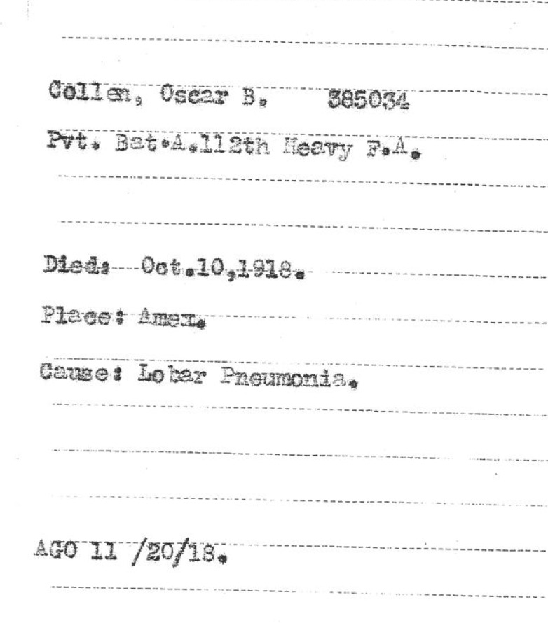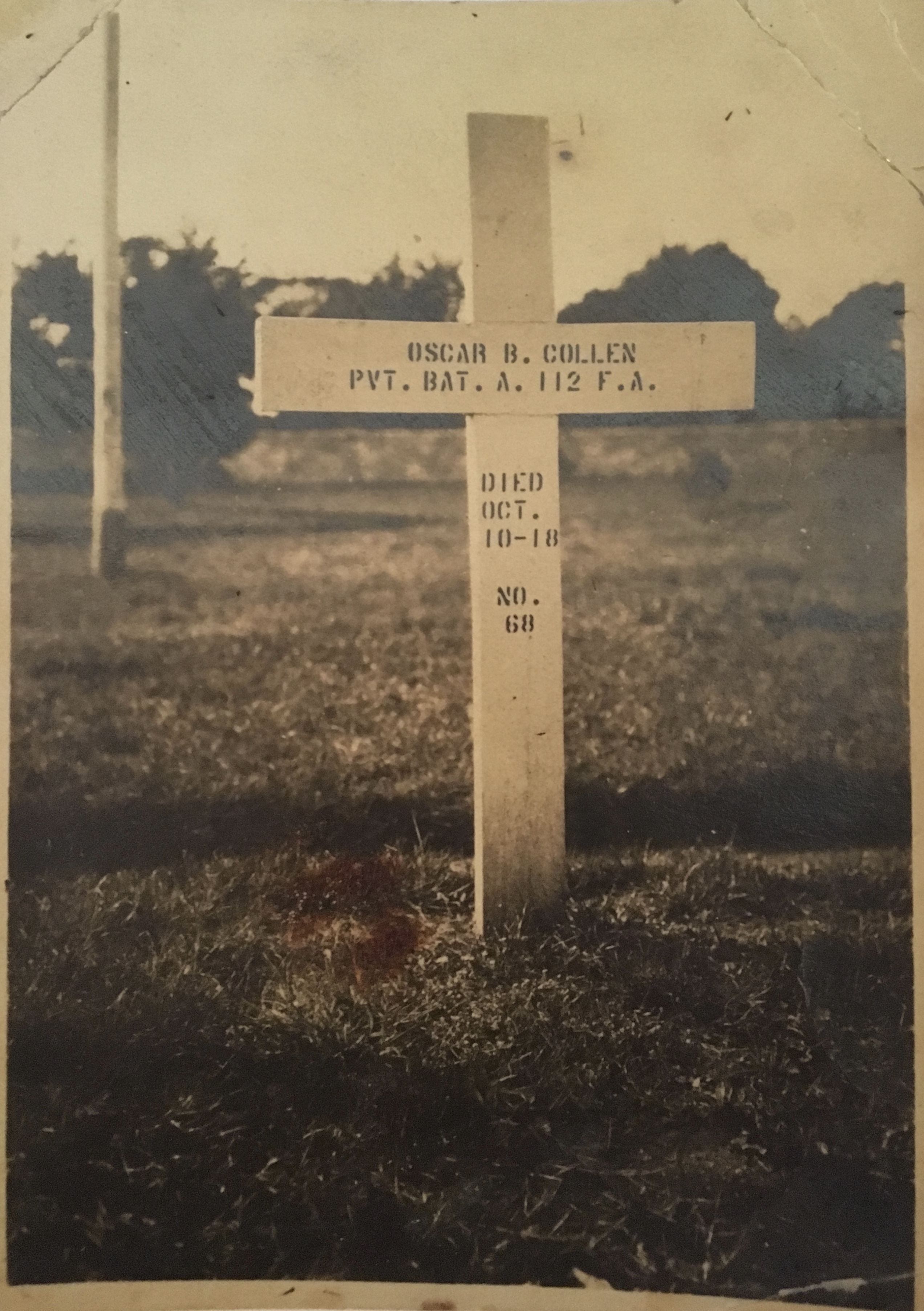 After just a few months in France, Collen fell ill. He died on October 10, in the midst of the Meuse-Argonne Offensive as well as the second major wave of the influenza pandemic. He was buried in the temporary cemetery at Camp de Meucon in Morbihan, France.