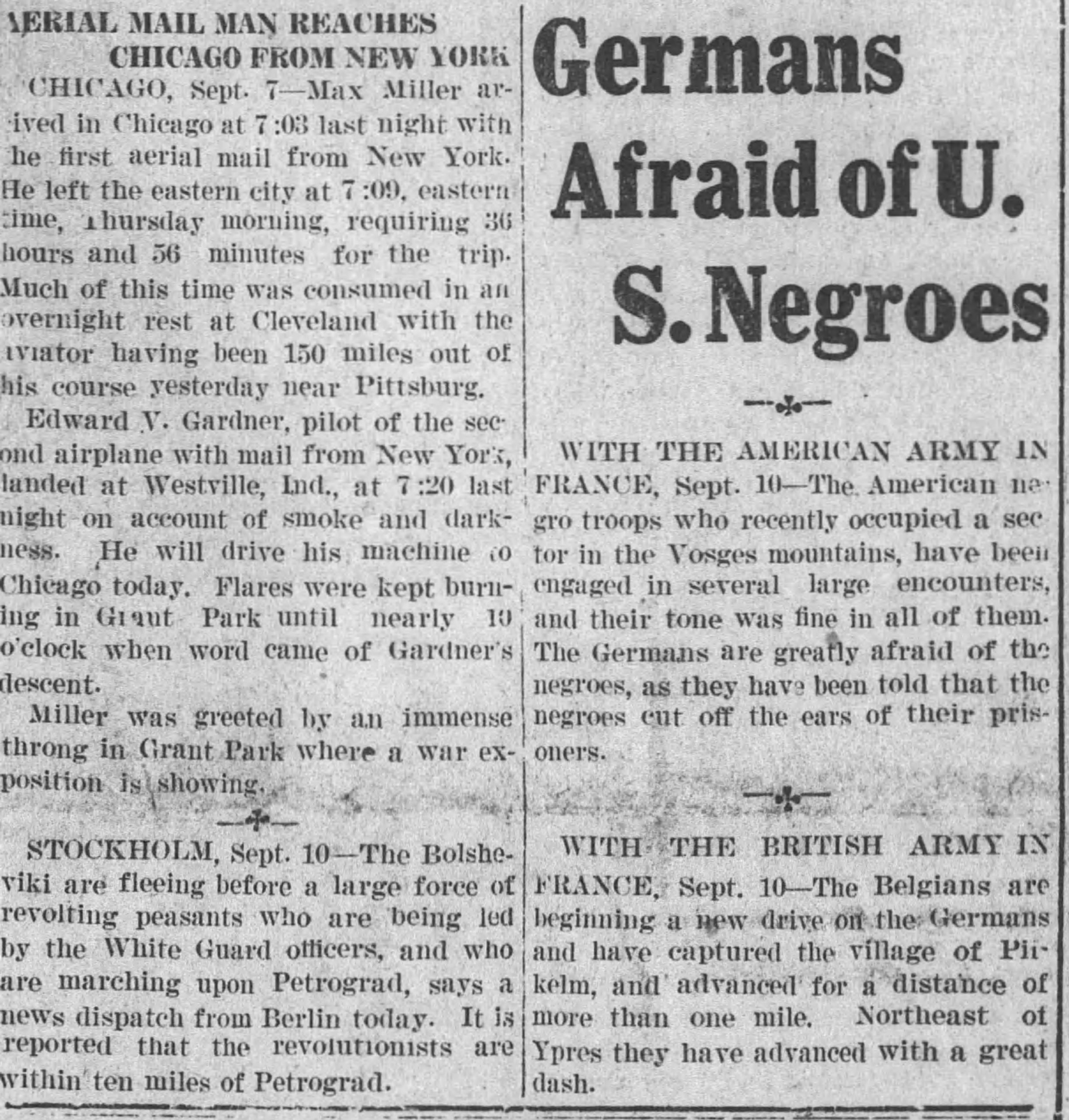 “Germans Afraid of U.S. Negroes.” The Troy Messenger [Troy, AL], September 11, 1918. Newspapers.com (320956383).