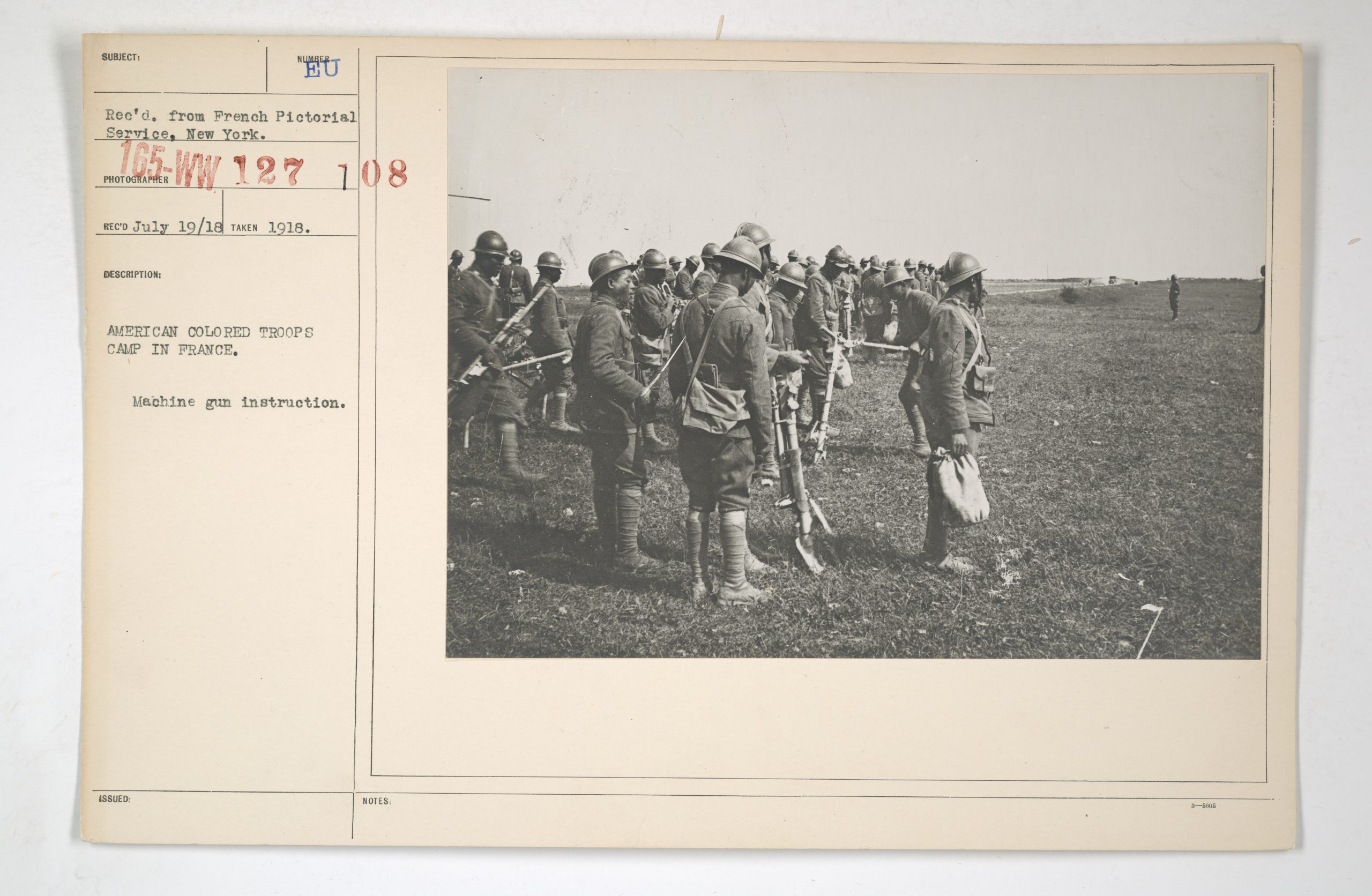 French Pictorial Service. Colored Troops – American Colored Troops Camp in France. Machine gun instruction. Photograph. July 19, 1918. National Archives and Records Administration (NAID 26431498). https://catalog.archives.gov/id/26431498.