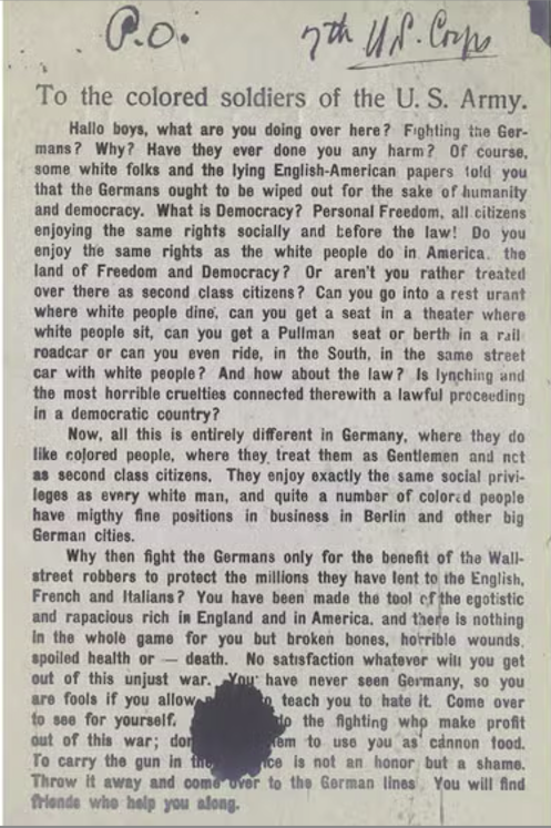 The German military used the racial divide in America to target African American soldiers with propaganda. They disseminated leaflets entitled “To the Colored Soldiers of the American Army,” questioning why they would fight for a country that subjected them to racial discrimination.