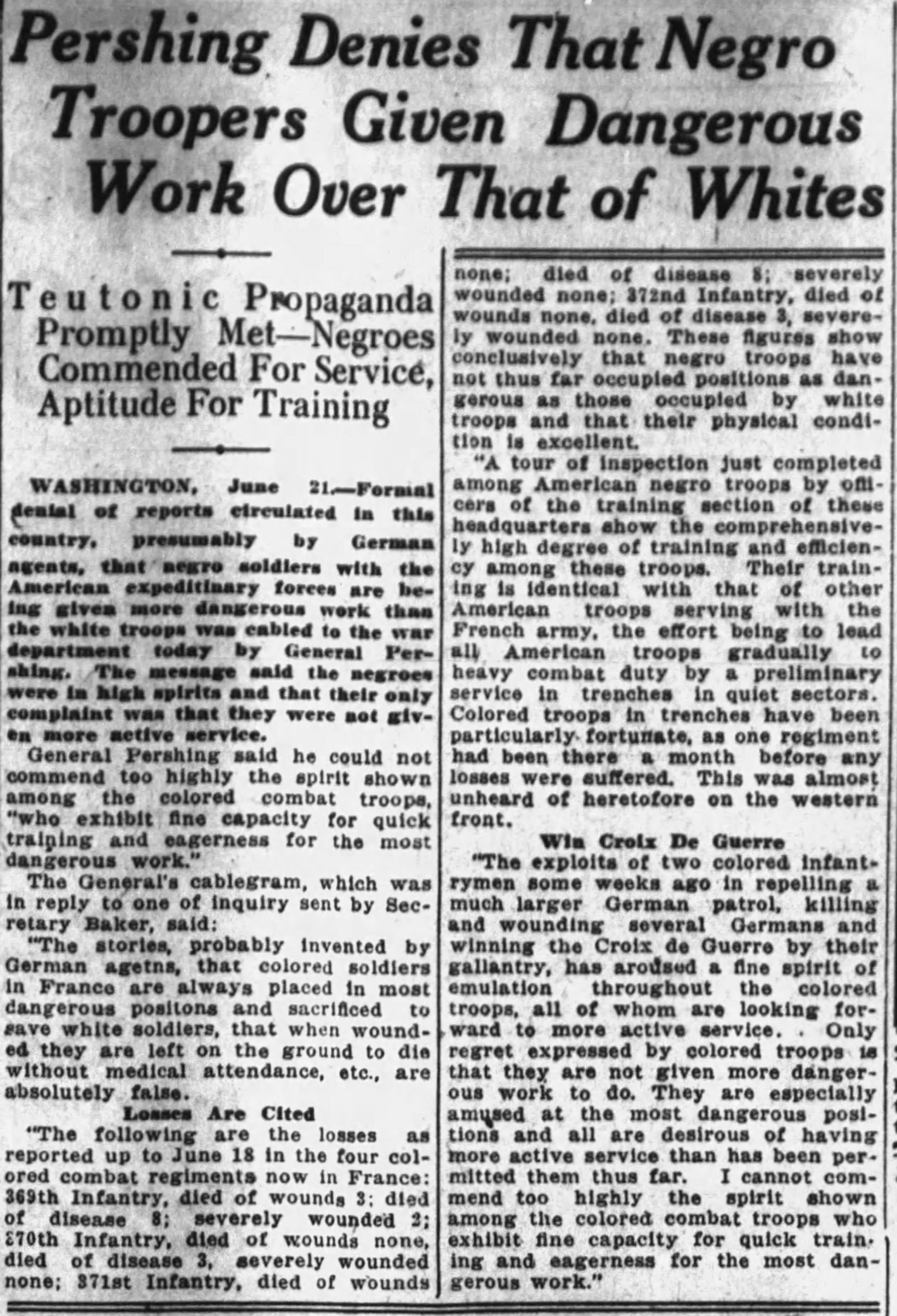 “Pershing Denys Giving Negro Troopers Dangerous Work Over That of Whites.” The Montgomery Advertiser [Montgomery, AL], June 22, 1918. Newspapers.com (412828330).