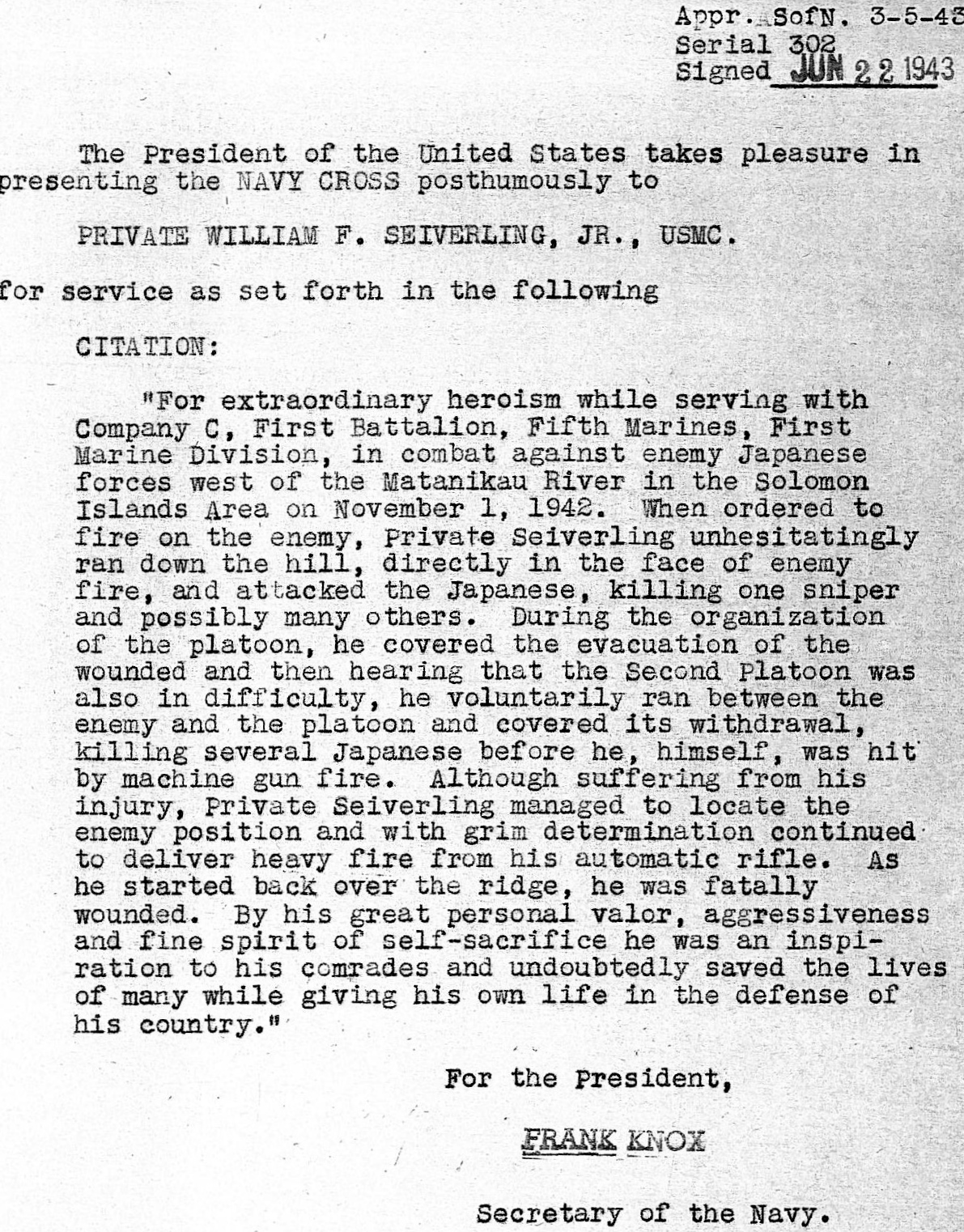 In a final attempt to force the Japanese out of the area surrounding the Matanikau River, Seiverling’s unit attacked a well fortified enemy on the morning of November 1, 1942. During intense fighting, Seiverling exposed himself to sniper and machine gun fire countless times to aid injured members of his platoon. At one point in the battle, Seiverling ran between an enemy position and another Marine platoon to provide cover and support while the wounded were evacuated.