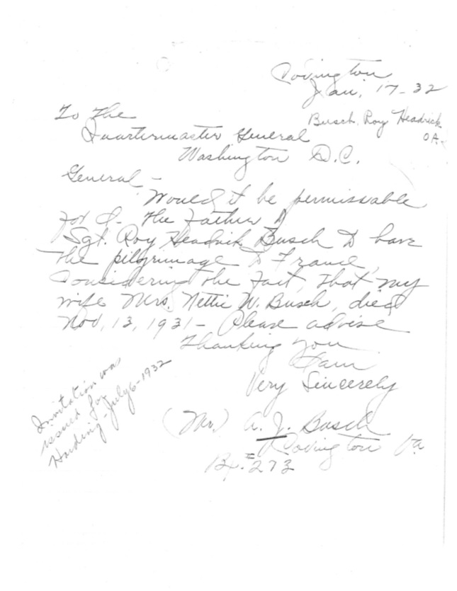 With the passage of the Gold Star Mothers Pilgrimage in 1929, Busch’s mother, Nettie, made plans to visit the final resting place of her son, along with his brothers in arms in France. Unfortunately, before the trip could take place, she died in 1931. Alchaney, Busch’s father, asked the U.S. government if he could take his wife’s place and make the trip to say a final goodbye to his son but his request was denied.