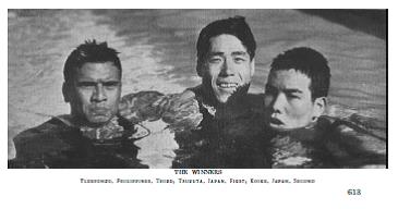 The Winners. Yldefonzo, Philippines. Third; Tsuruta, Japan, First; Koike, Japan, Second. 200m breaststroke, 1932 Olympics. Photograph. 1932. LA84 Foundation. library.la84.org/6oic/OfficialReports/1932/1932spart4.pdf