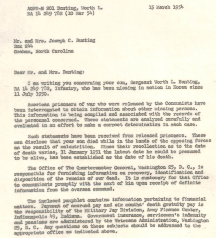 “Cpl. Worth L. Bunting Of Graham Reported Missing In Korean Action.” The Daily Times-News [Burlington, NC], August 15, 1950. Newspapers.com (52638955).