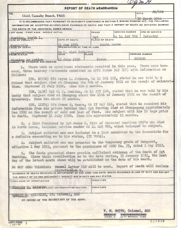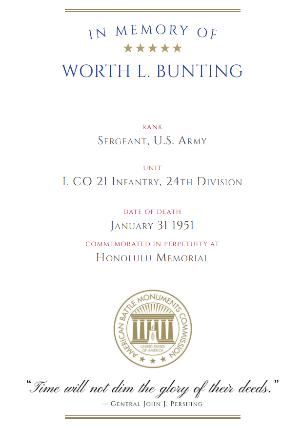 Worth L. Bunting. Korean Conflict Casualty File, National Archives and Records Administration. https://aad.archives.gov/aad/record-detail.jsp?dt=194&mtch=1&cat=all&tf=F&q=worth+bunting&bc=&rpp=10&pg=1&rid=3163.