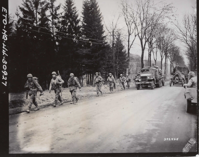 Gedicke, Albert J. Infantrymen of the 317th Regiment, 80th Division, U.S. First Army move up highway to strike…northeast of Luxembourg in the vicinity of Junglinster. Photograph. December 21, 1944. National Archives and Records Administration (111-SC-272425). Image.