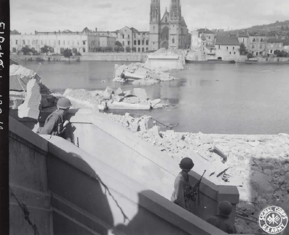 U. S. infantry patrol reaches bank. Returning Nazi fire across river. Photograph. September 5, 1944. National Archives and Records Administration (111-SC-194555). Image.