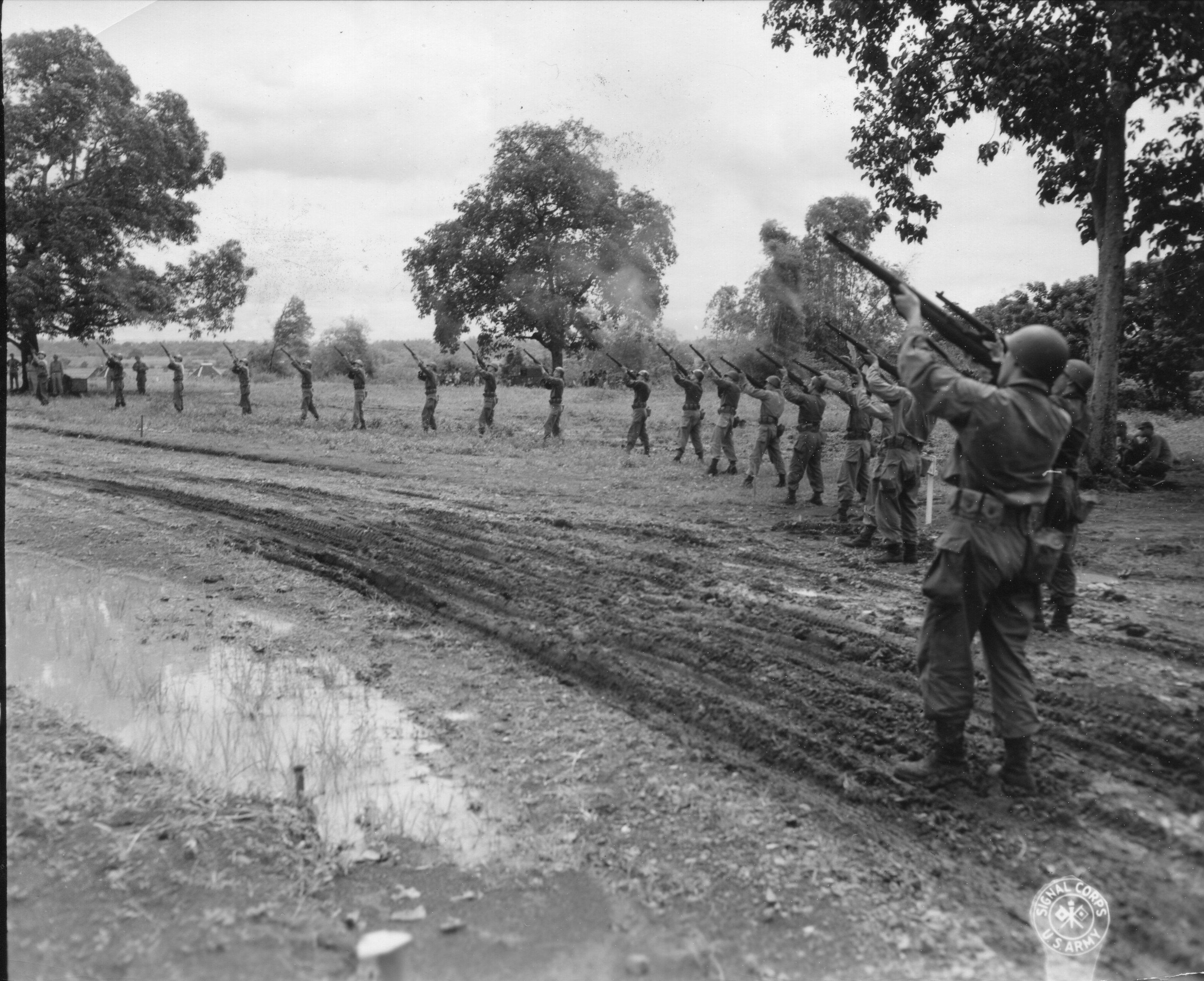 Rogers, Hubert F. Honoring officers and men of the (43rd Winged Infantry Div) who were killed during the (Luzon Campaign). Three men of the firing squad firing volley after volley in the (US Cemetery No. 2 Manila, P.I.). Photograph. June 24, 1945. National Archives and Records Administration (SC 209502). Image.