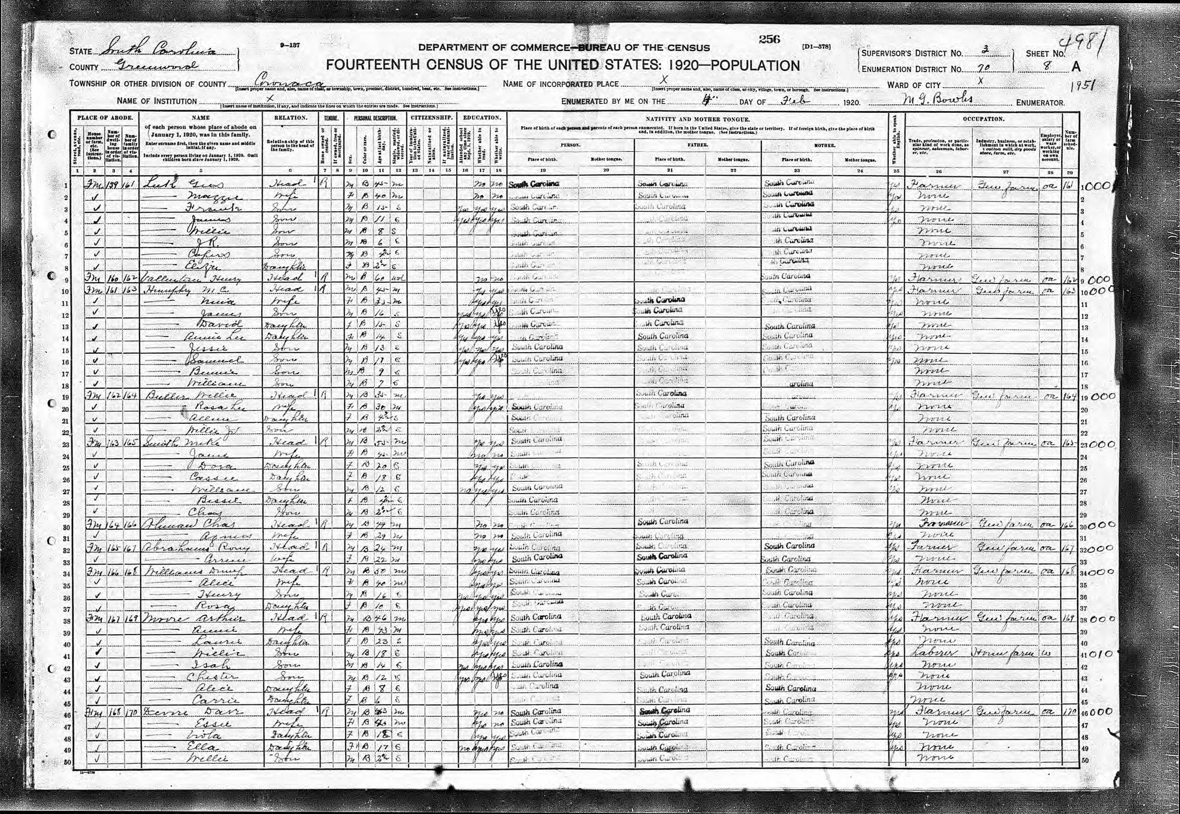 South Carolina, Greenwood County. 1920 U.S. Census. Digital images. https://ancestry.com.