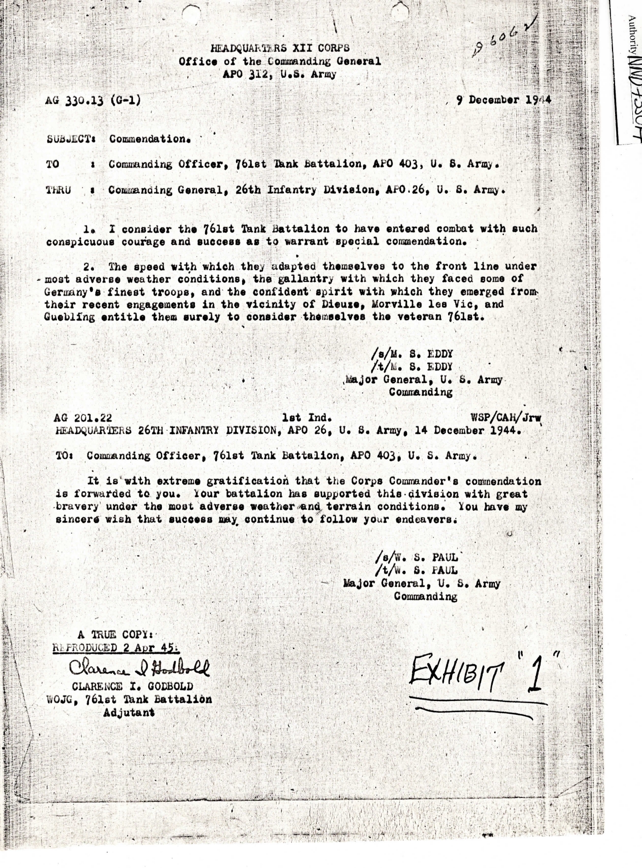 Despite the losses, the 761st Tank Battalion passed every test. Major General Manton J. Eddy, commanding officer of the Third Army’s XII Corps, singled out the Black Panthers with high praise, “I consider the 761st Tank Battalion to have entered combat with such conspicuous courage and success as to warrant special commendation,” Eddy wrote, praising the “speed,” “gallantry” and “great bravery” that led Major General Willard S. Paul to express “extreme gratification” to the unit.