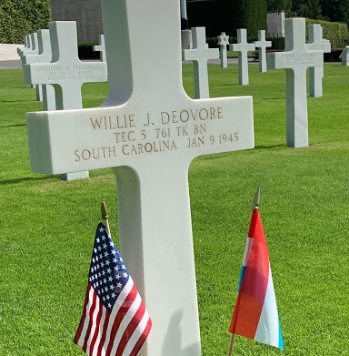 On January 14, 1945, five days after he was killed, Devore was buried in the U.S. military cemetery in Grand-Failly, in northeast France, near the border France shares with Luxembourg and Belgium. His remains were interred in Grand-Failly for four years and then, upon his mother’s request, were transported approximately 75 kilometers to Luxembourg American Cemetery. On March 22. 1949, Devore’s remains were re-interred in Luxembourg American Cemetery, his final resting place.