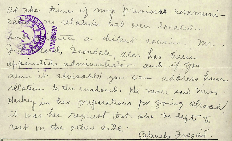 News of Harkey’s death was sent to her dearest friend and roommate, Blanche Frazier. She informed the military that Harkey had no known living relatives and that Harkey’s wish was for her body to remain overseas. Harkey was laid to rest at the American Military Cemetery in Magdalen Hill, Winchester, England. In 1922, her body was disinterred and placed in her final resting spot—Brookwood American Cemetery in Brookwood, England.