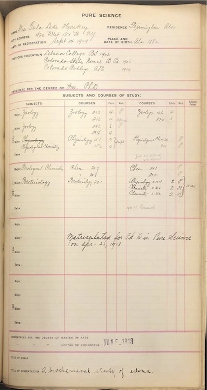 Harkey then enrolled in Columbia University’s Ph.D. in Pure Science program, which focused on zoology, physiological chemistry, biological chemistry, and bacteriology. She received her Ph.D. from Columbia in June 1918 after completing her dissertation on edema, a condition characterized by excess fluid trapped in the body’s tissues.