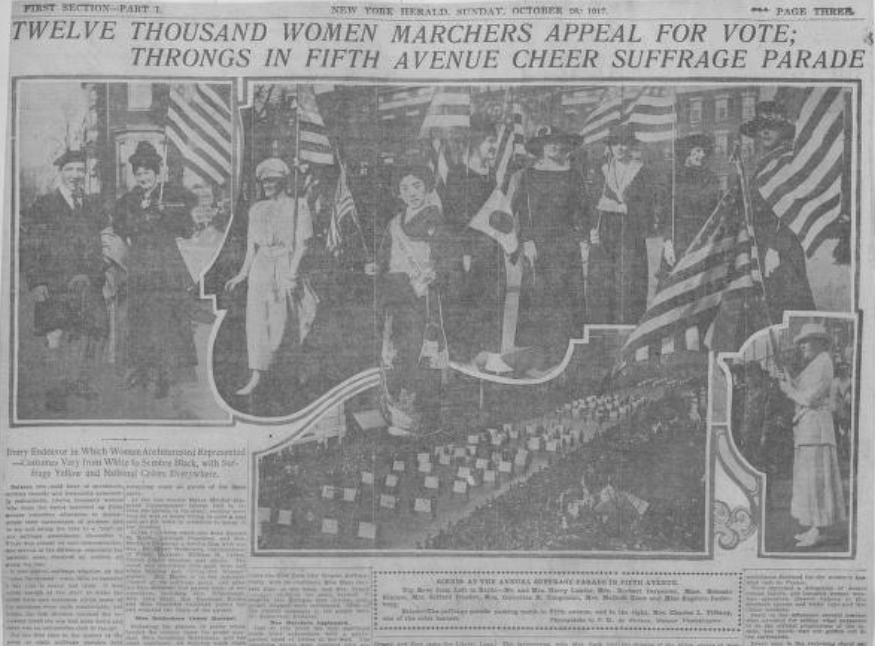 “Twelve Thousand Women Marchers Appeal for Vote; Throngs in Fifth Avenue Cheer Suffrage Parade.” New York Herald [New York, NY], October 27, 1917. https://www.loc.gov/resource/2004540423/1917-10-27/ed-1/?sp=74&st=image&r=-0.601,0,2.202,1.336,0.