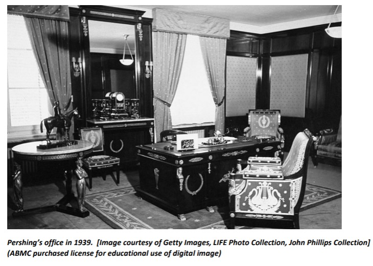 Photographs include the Pershing desk and Pershing’s office in 1939 at Pershing Hall.