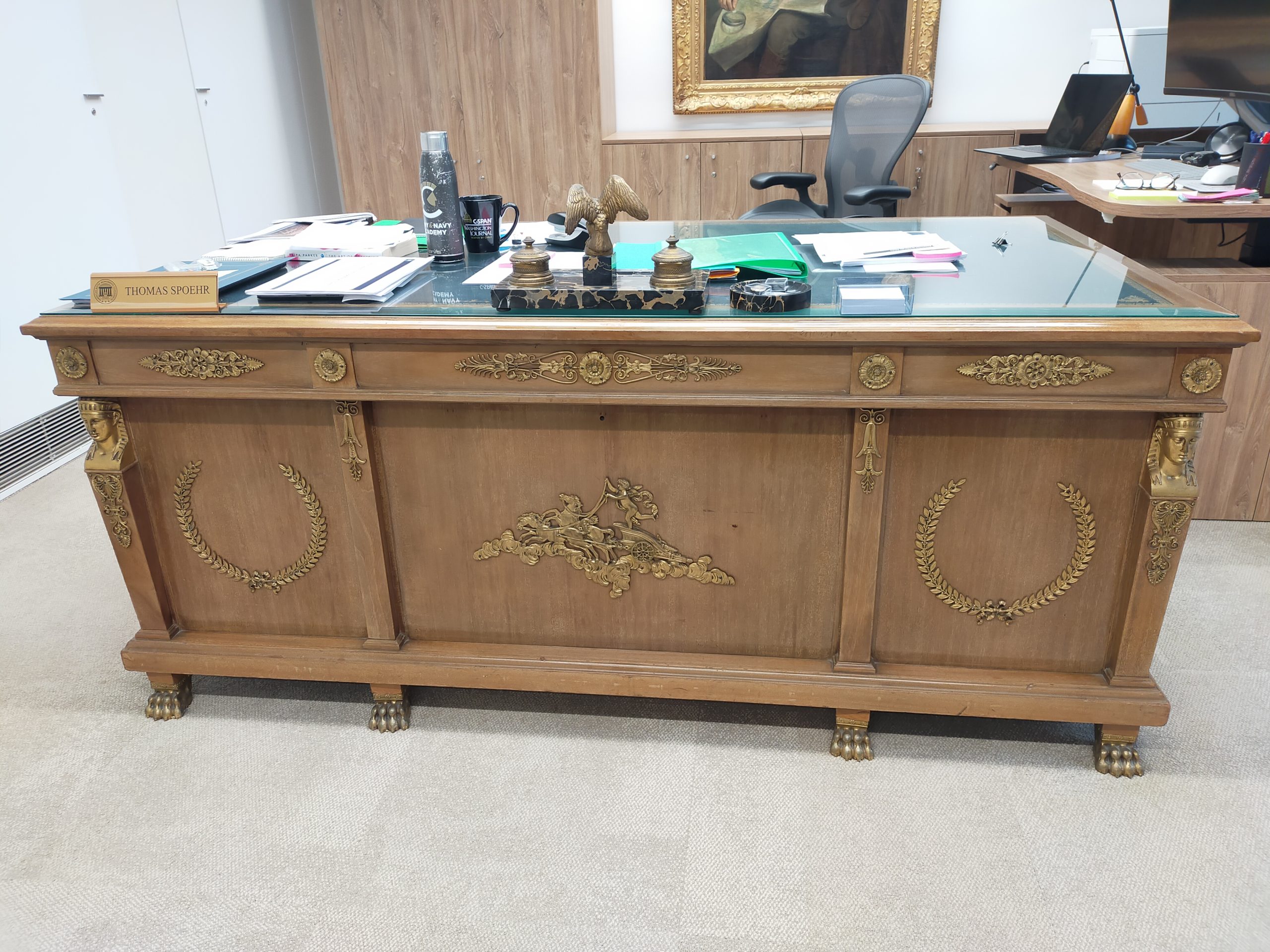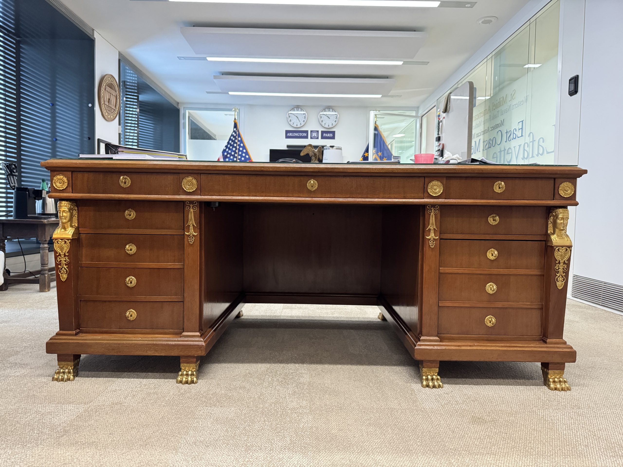 The Curator’s Collection presents, General John J. Pershing’s desk which embodies both craftsmanship and legacy. With its leather-trimmed surface, gilt-bronze clawed feet, and ornate detailing, including Egyptian-inspired motifs and classical laurels, the desk reflects the grandeur fitting the United States’ General of the Armies. Believed to have been crafted in 1920s Paris, it is part of a distinguished suite of furnishings associated with Pershing’s office at the American Embassy.