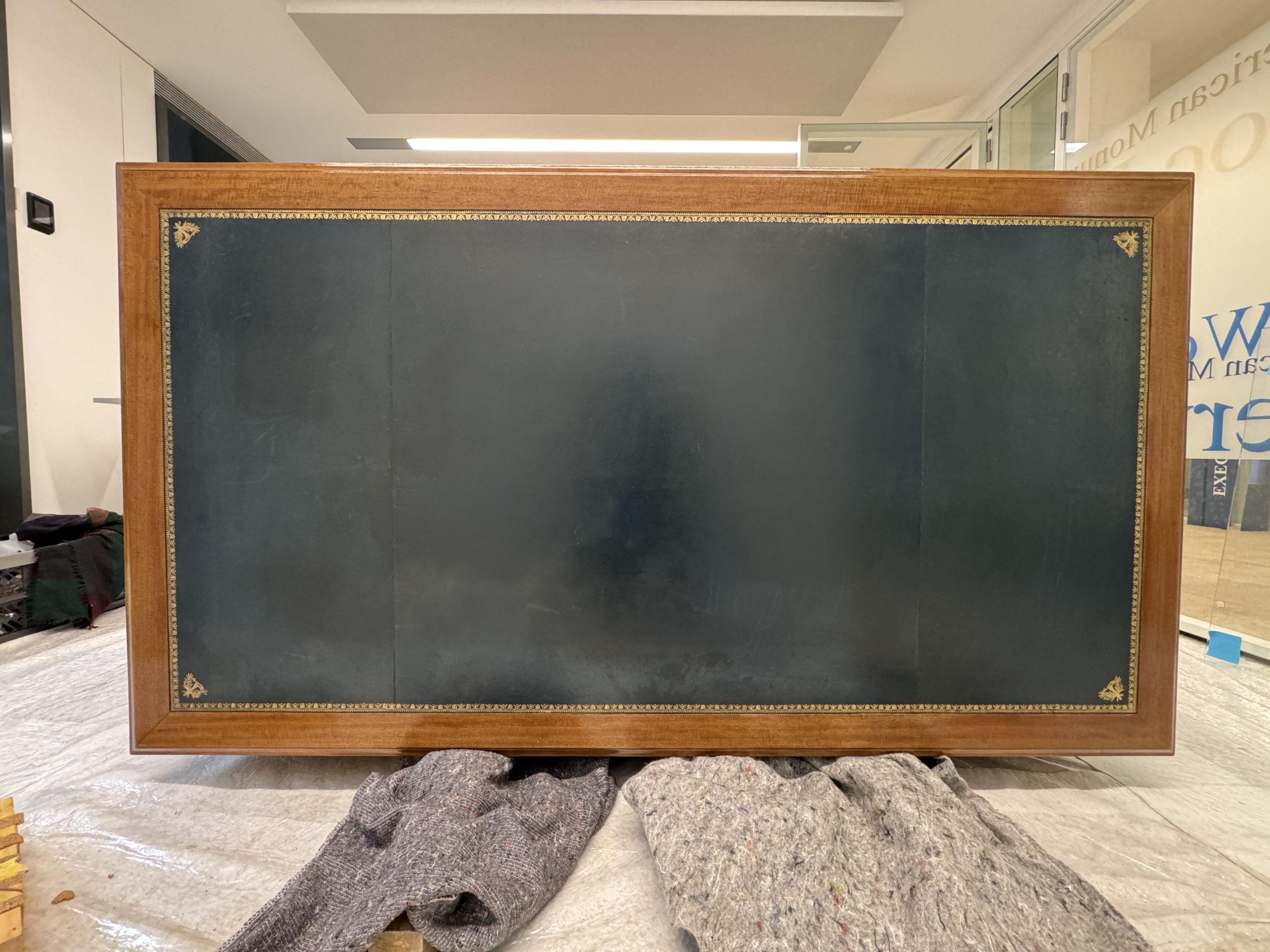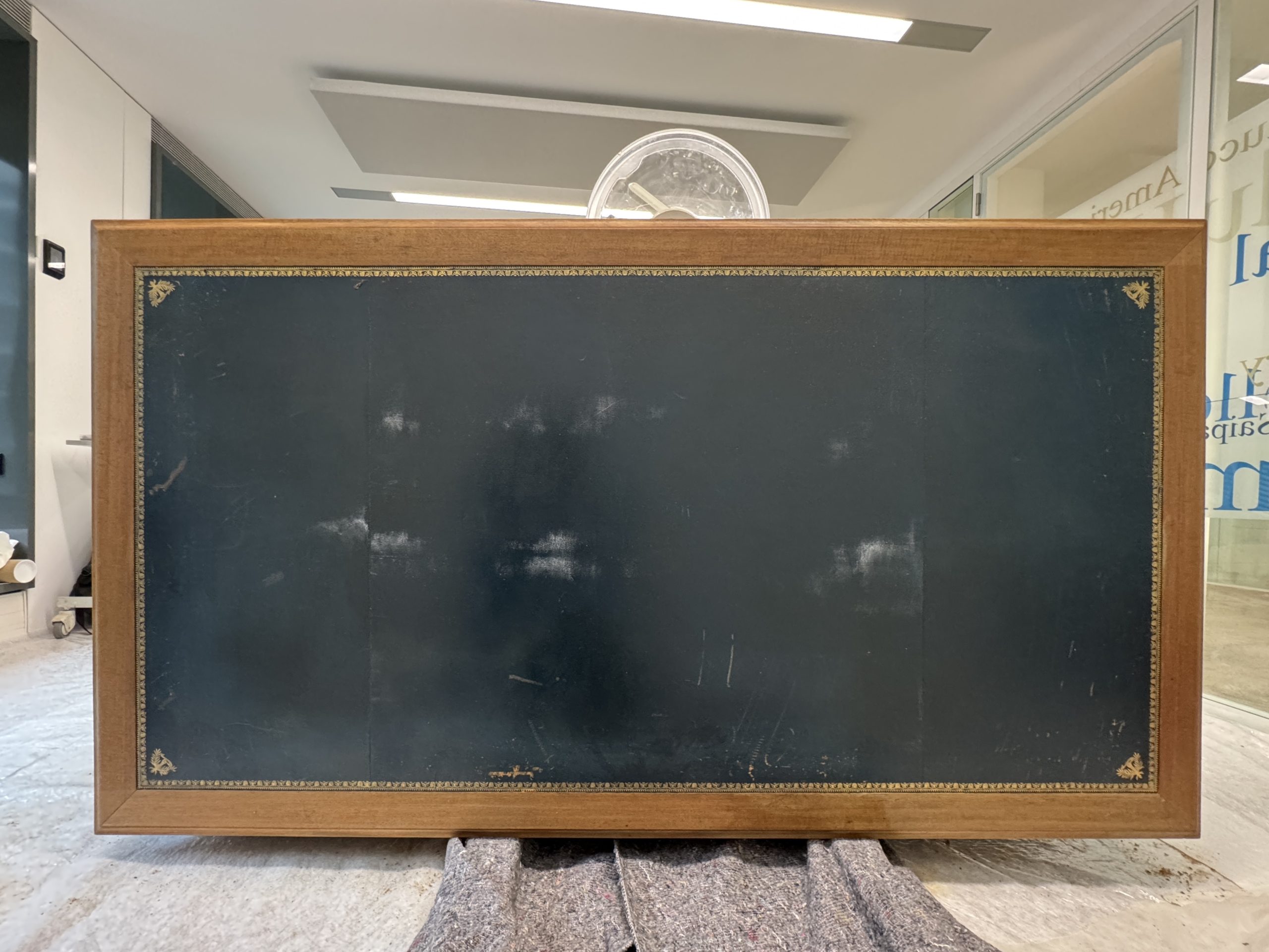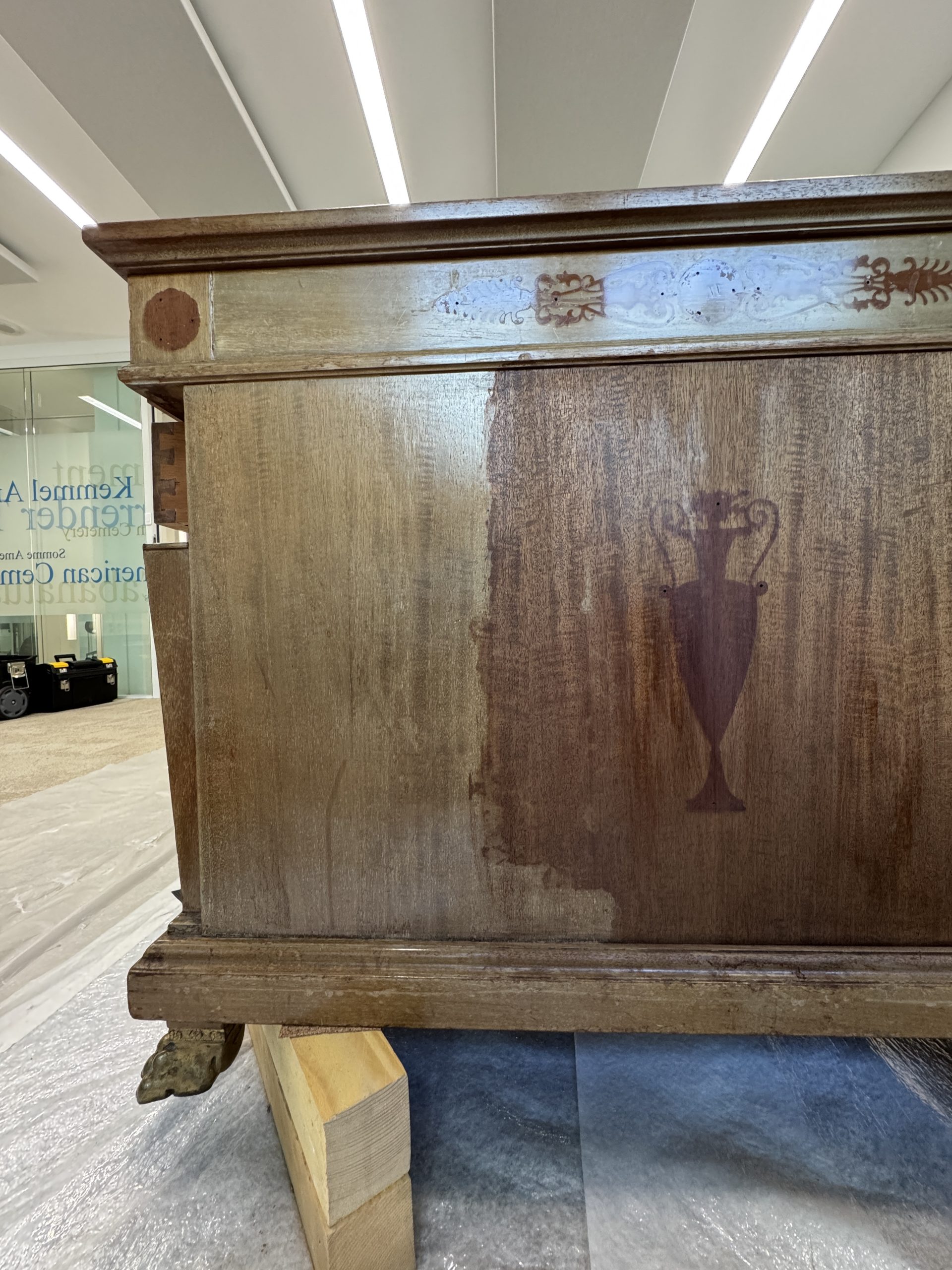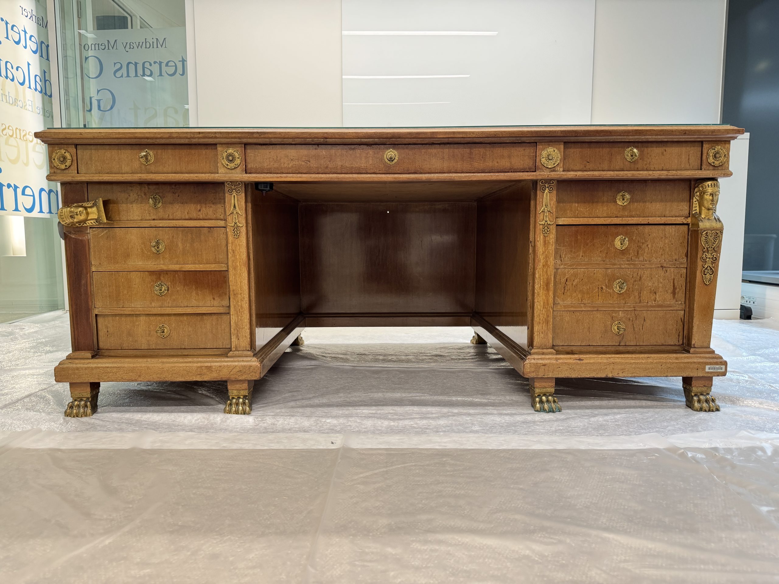 The wooden structure was cleaned, repaired, and reinforced. Missing mahogany elements were recreated, and deep gouges — especially around the central drawer — were filled and shaped to restore the desk’s form and ensure long-term stability.
