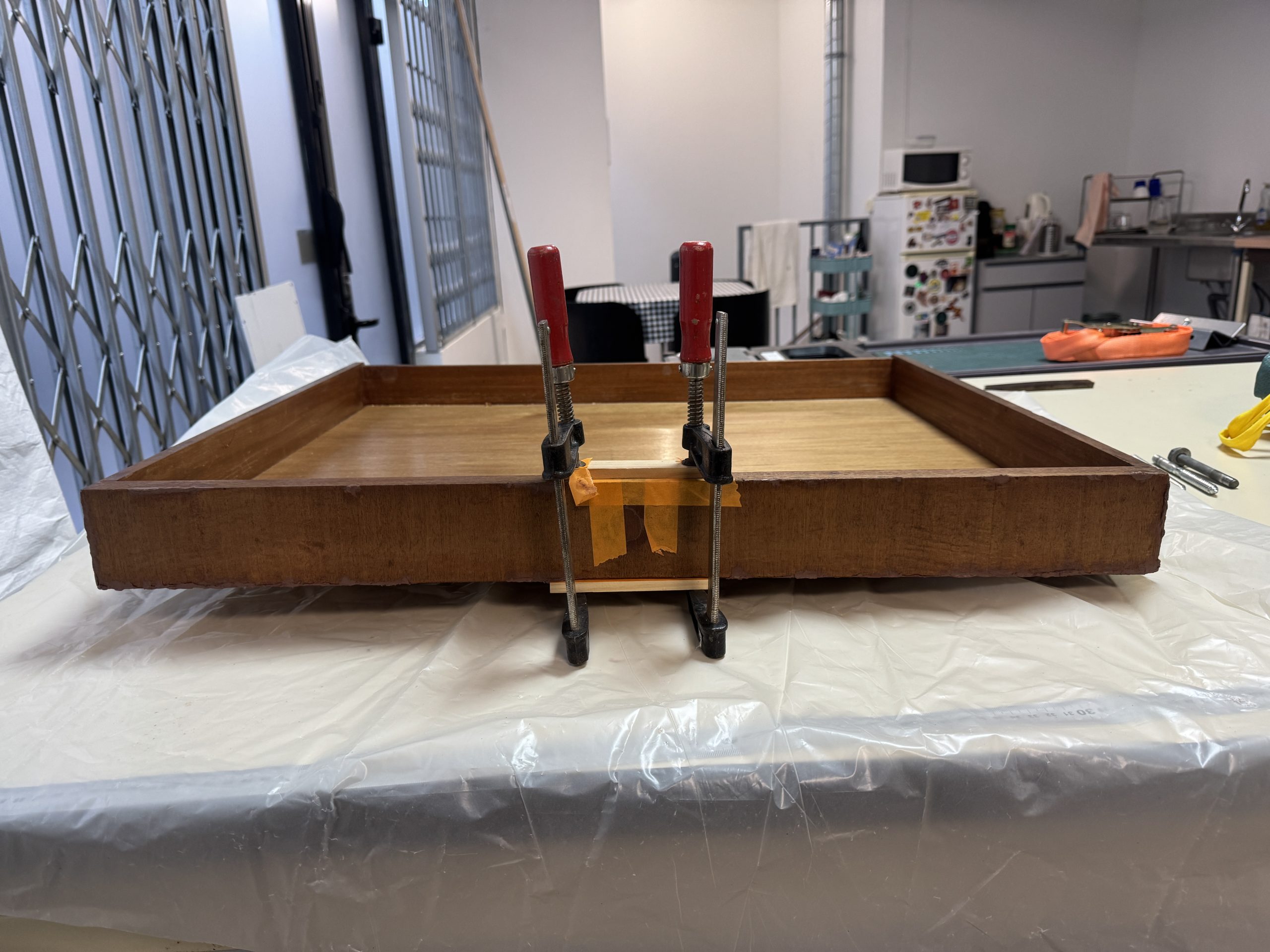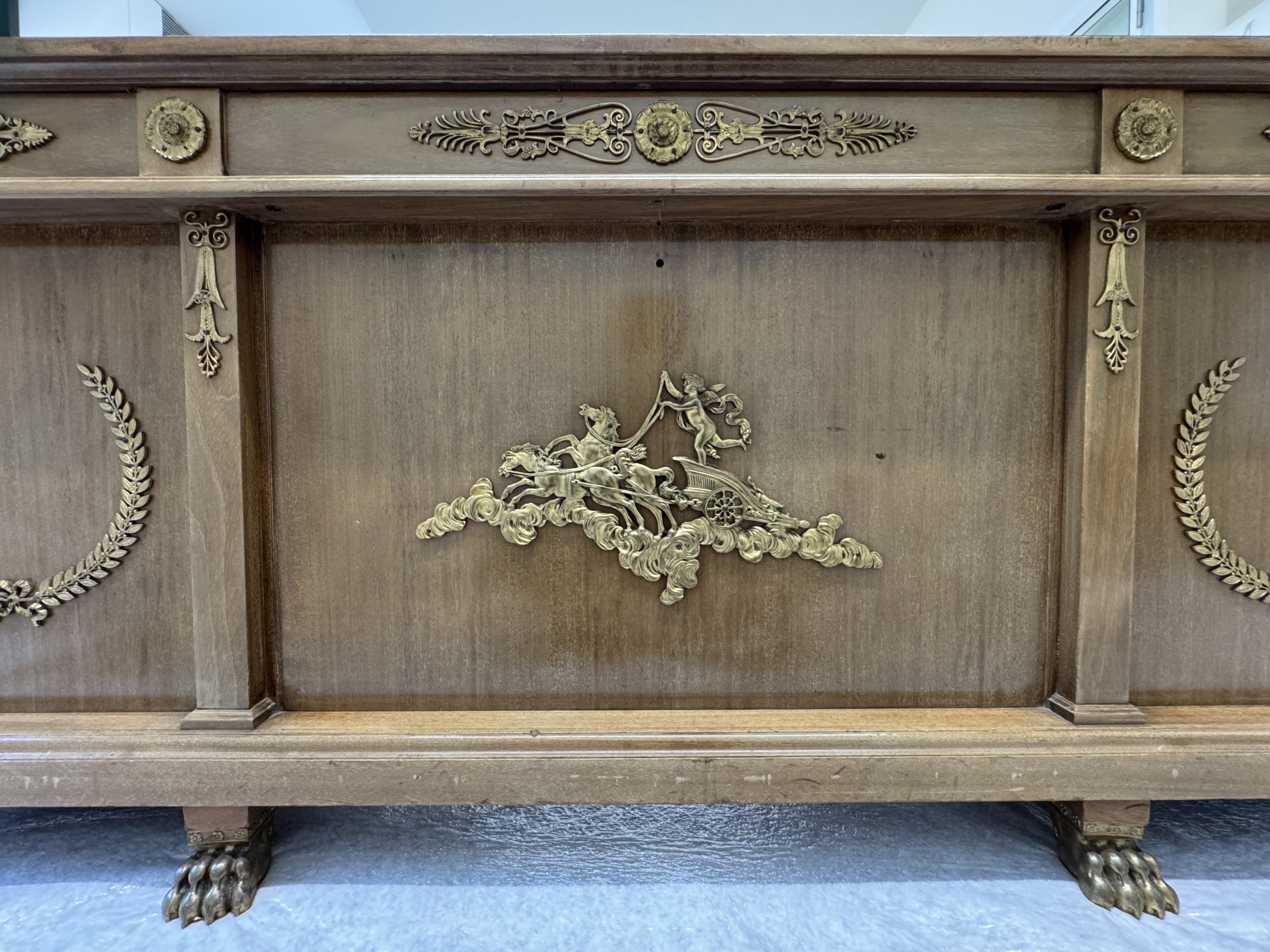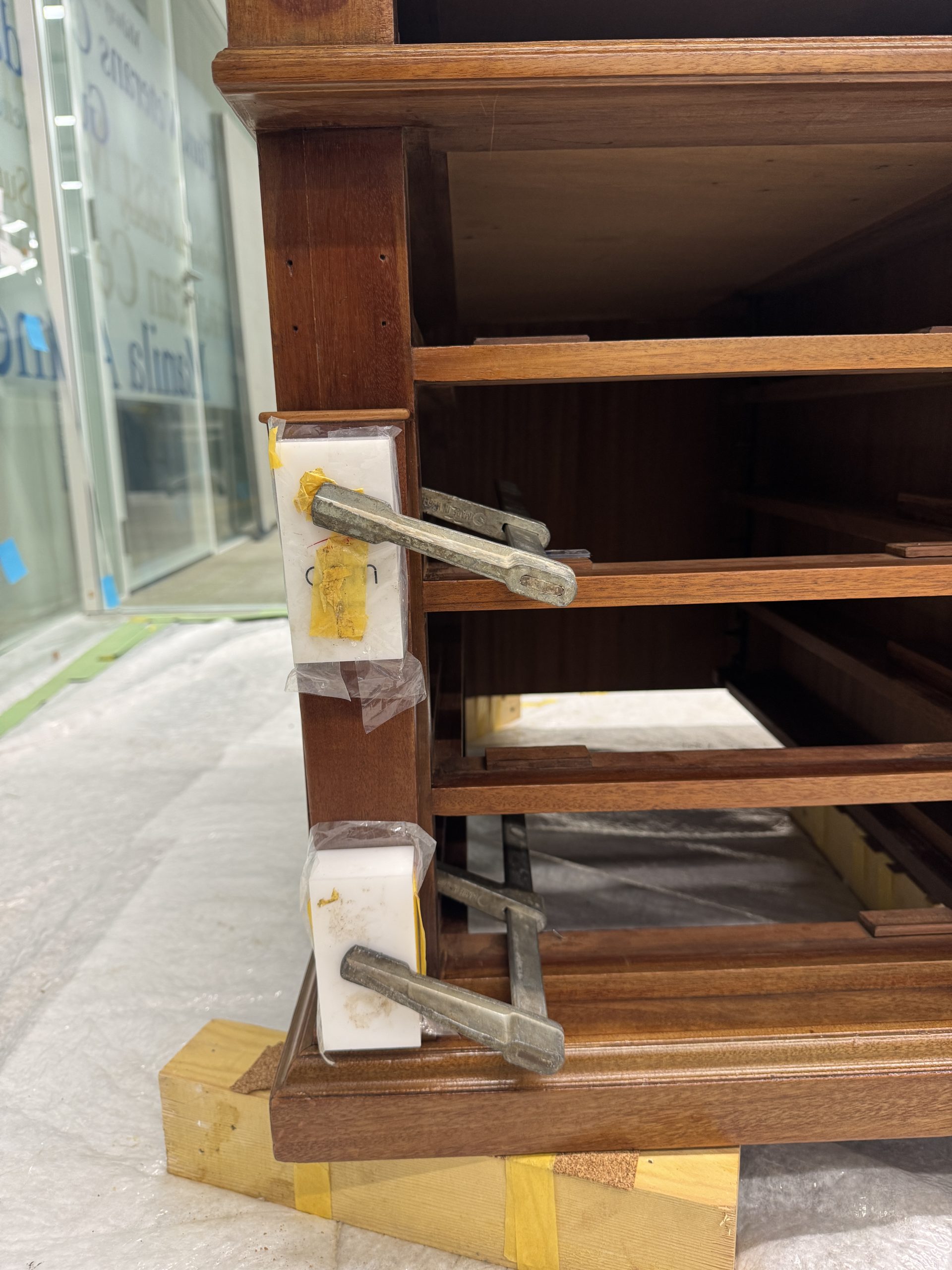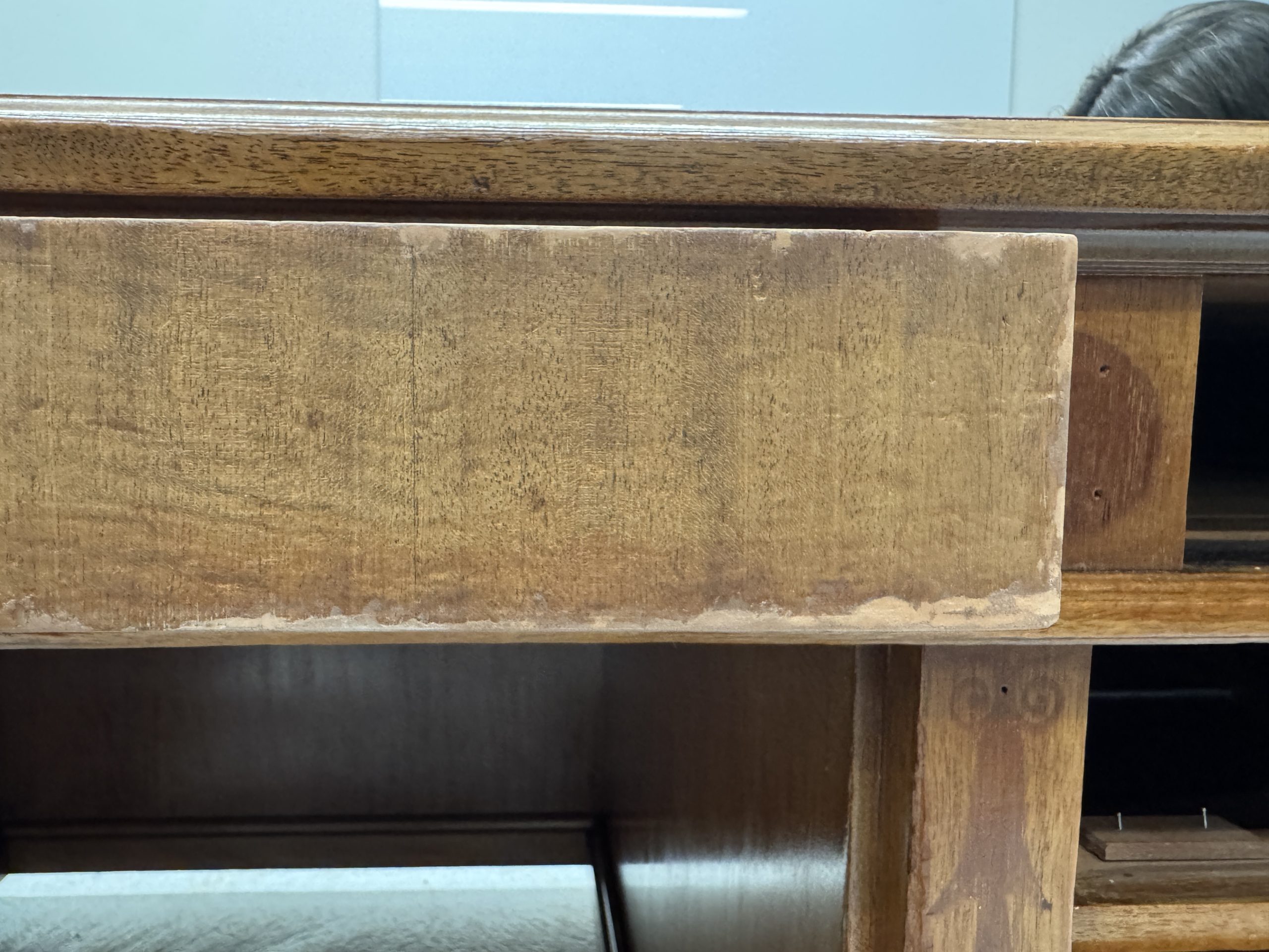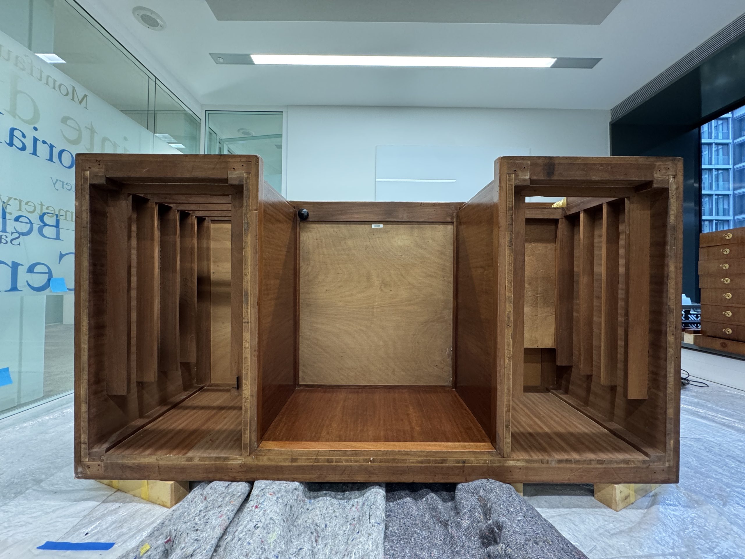 The wooden structure was cleaned, repaired, and reinforced. Missing mahogany elements were recreated, and deep gouges — especially around the central drawer — were filled and shaped to restore the desk’s form and ensure long-term stability.