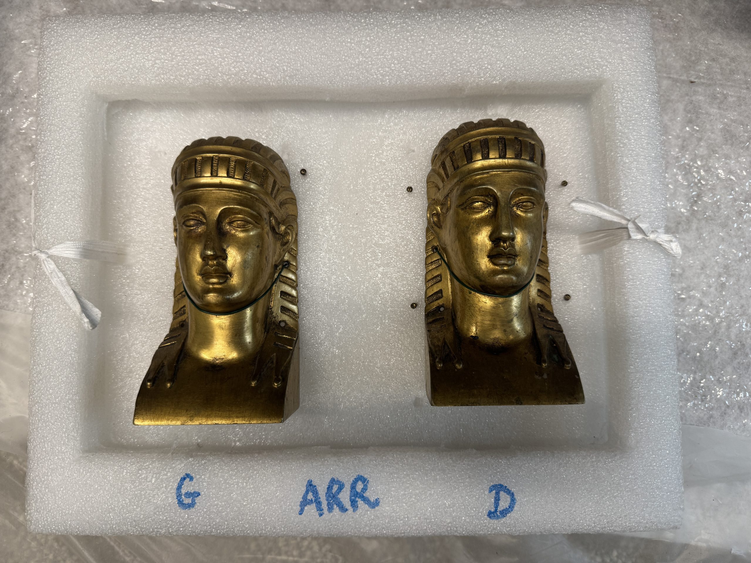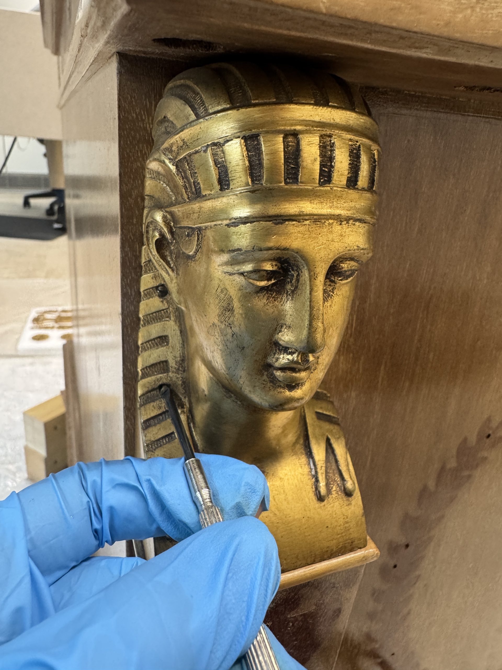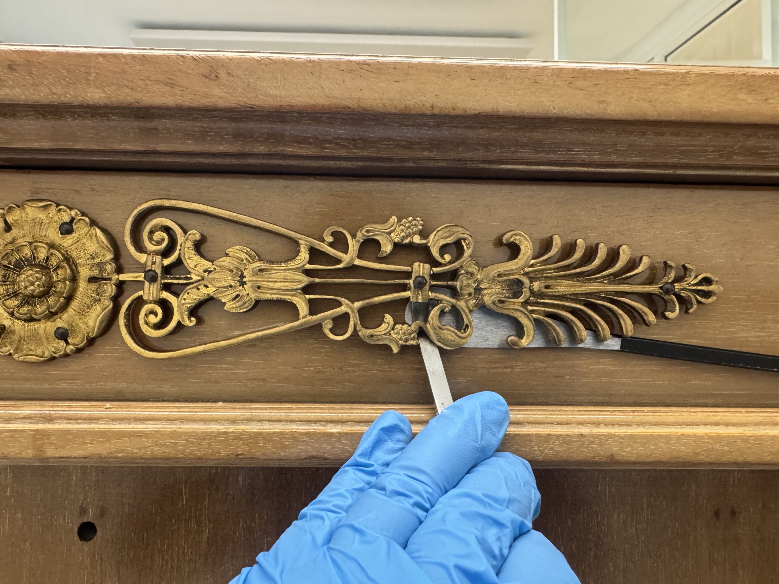 The gilt-bronze ornaments were removed, cleaned, and restored in a specialized metal studio. Their surfaces were degreased and treated to remove corrosion and old polishing residues, and protected with a clear varnish to recover their original warmth and detail.